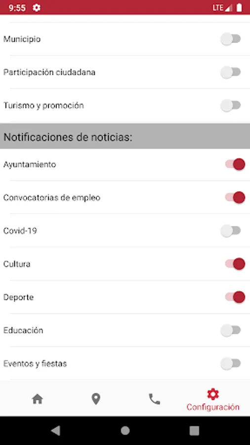 If the citizen is interested in receiving notifications of new content, they must give their consent to the sending of notifications by the City Council, enabling them through the "Application notifications" menu of their Android operating system. In addition, you can select in the mobile application the contents about which you want to be notified from the configuration option of the main menu. This consent can be withdrawn with the same ease with which it was given, through the indicated means, without affecting the notifications received before the withdrawal. You can obtain more information in the "Privacy Policy" section.