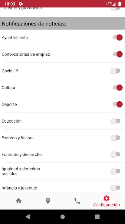 If the citizen is interested in receiving notifications of new content, they must give their consent to the sending of notifications by the City Council, enabling them through the "Application notifications" menu of their Android operating system. In addition, you can select in the mobile application the contents about which you want to be notified from the configuration option of the main menu. This consent can be withdrawn with the same ease with which it was given, through the indicated means, without affecting the notifications received before the withdrawal. You can obtain more information in the "Privacy Policy" section.