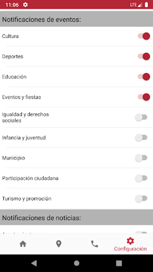 If the citizen is interested in receiving notifications of new content, they must give their consent to the sending of notifications by the City Council, enabling them through the "Application notifications" menu of their Android operating system. In addition, you can select in the mobile application the contents about which you want to be notified from the configuration option of the main menu. This consent can be withdrawn with the same ease with which it was given, through the indicated means, without affecting the notifications received before the withdrawal. You can obtain more information in the "Privacy Policy" section.
