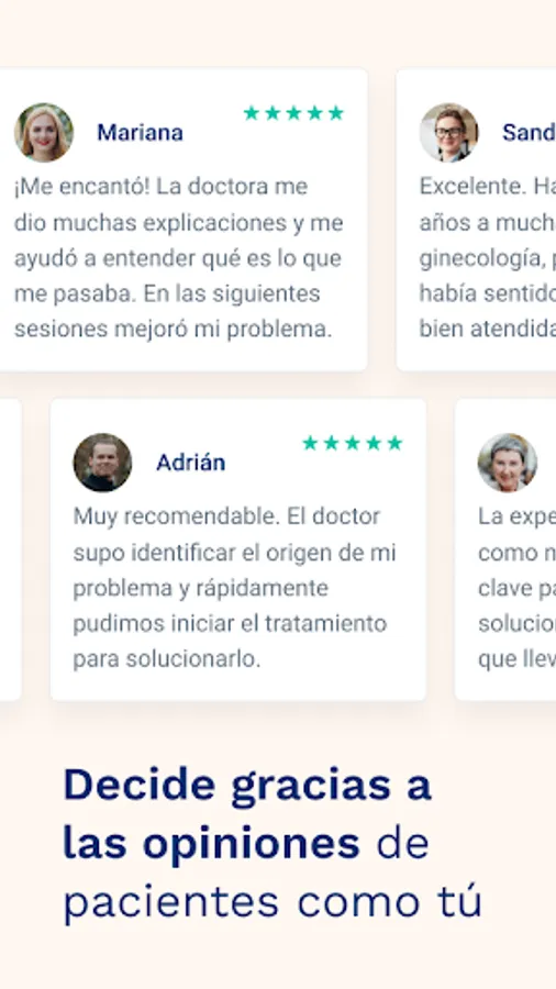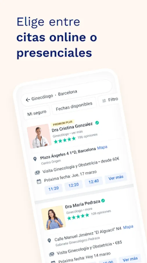 By downloading our application you will have access to more than 120,000 specialists from all over the country to book medical appointments quickly and easily directly from your mobile. You can filter your searches by specialty, city, postal code, medical insurance (Adeslas, Allianz, Asisa, DKV, Mapfre, Muface, Sanitas, Zurich, etc.), treatments and even search directly on the map.