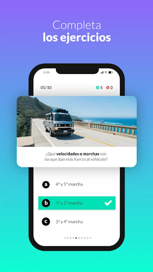 In the driving school application you will find more than 2,500 exam questions with exercises designed by experts in traffic training and mobility. You will have the security of learning what you need to pass the theoretical exam the first time.