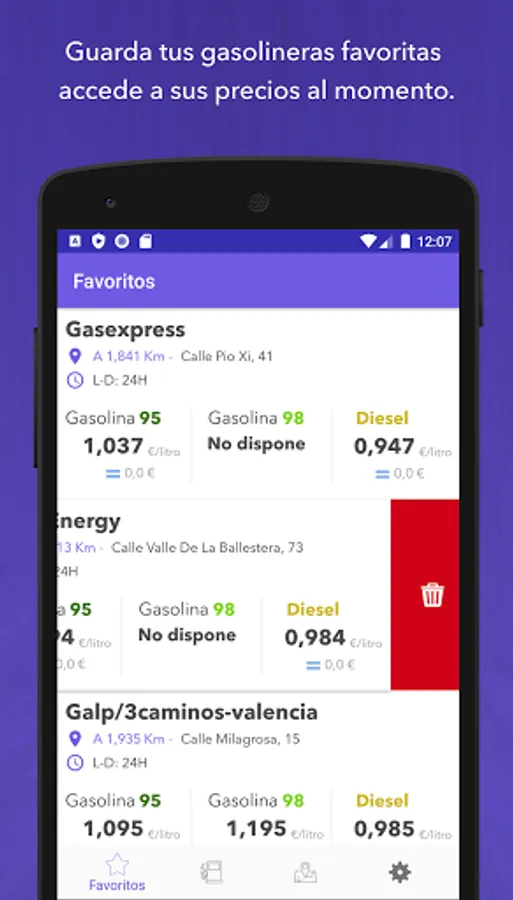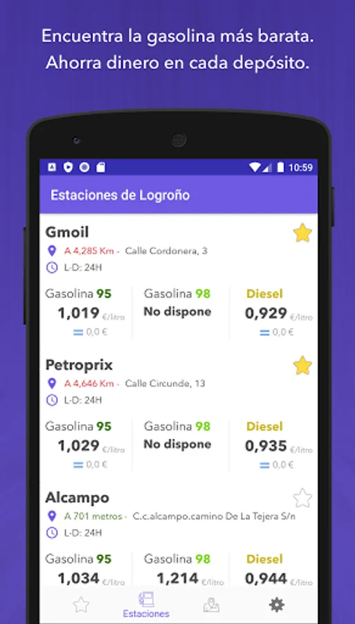 Gasoline 95, Gasoline 98 and Diesel prices from gas stations throughout Spain in the palm of your hand with GasOnline. A clear and simple interface that will help you choose and compare fuel prices at the gas stations in your location.