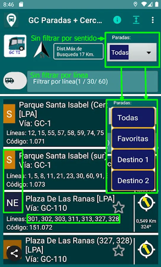 The application grants the closest stops, with an initial maximum distance of 2 km. (30 minutes walking).