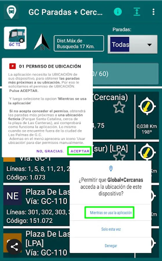 The application is only useful if you know where the device is, since you have to choose between 2500 stops, to select the closest ones. Grant the 'while using the app' permission.