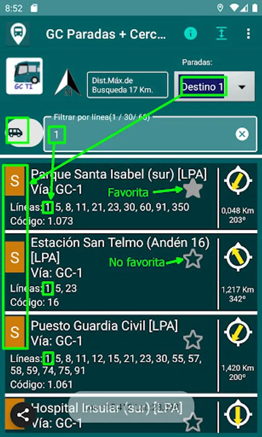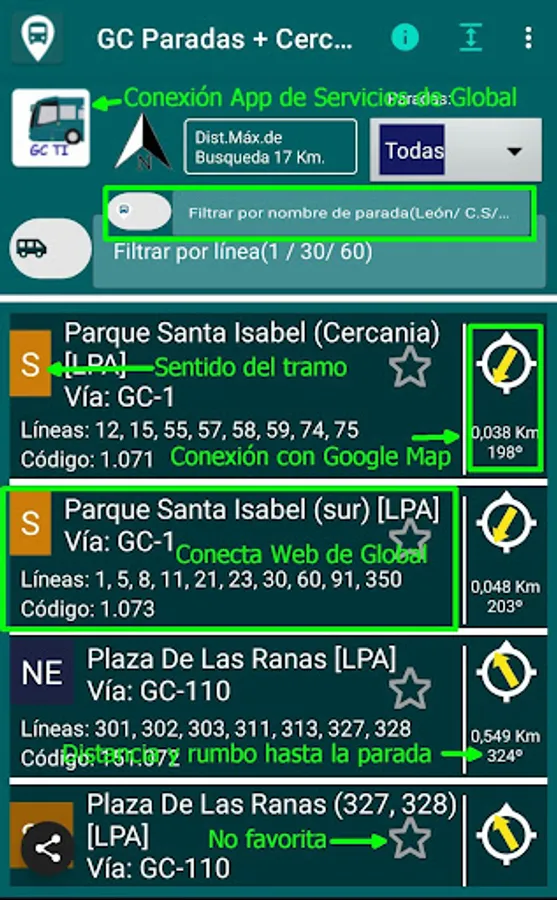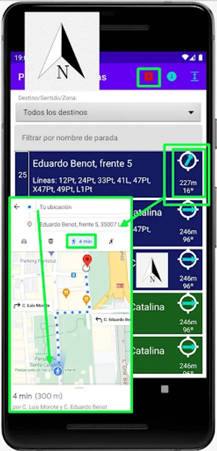 • Icon indicating the heading (azimuth) from the device to the stop (42º). For the icon to be consistent with its surroundings, you will need to orient your device to north. In case of difficulty in orienting, click on the icon.