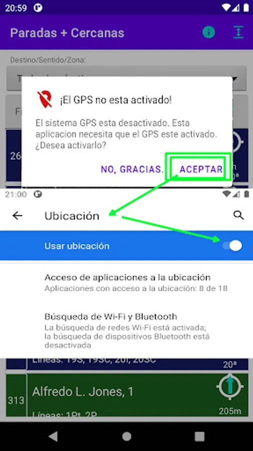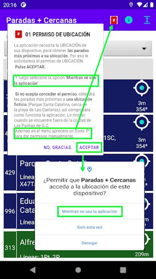 The application is only useful if you know where the device is, since you have to choose between 900 stops, to select the closest ones. Grant the 'while using the app' permission.