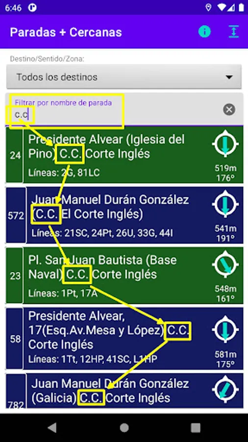 • Icon indicating the heading (azimuth) from the device to the stop (42º). For the icon to be consistent with its surroundings, you will need to orient your device to north. In case of difficulty in orienting, click on the icon.