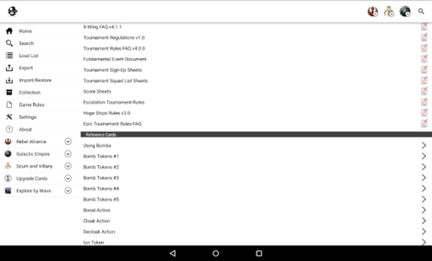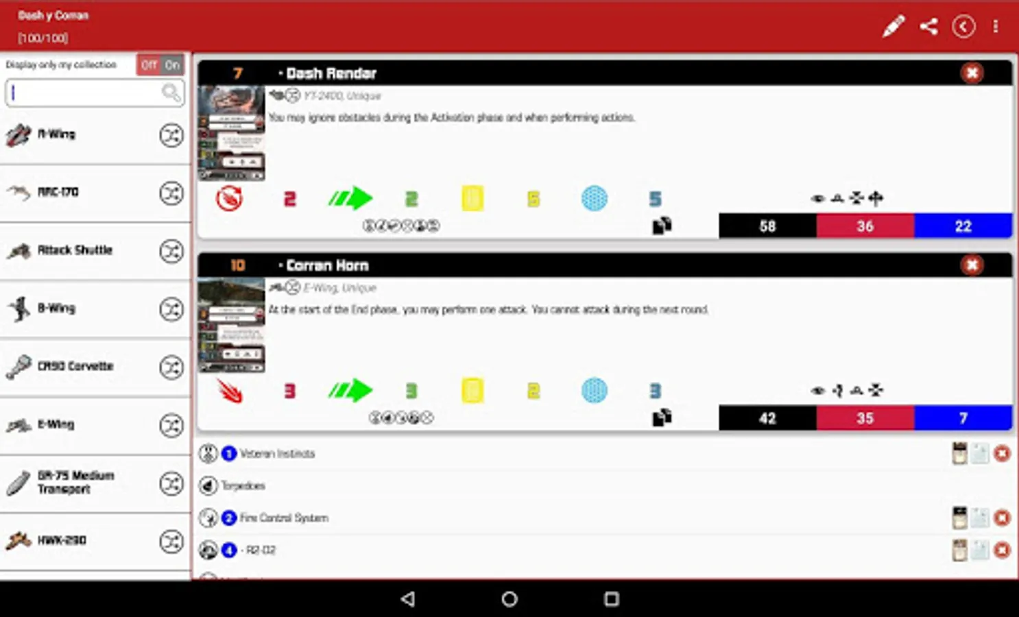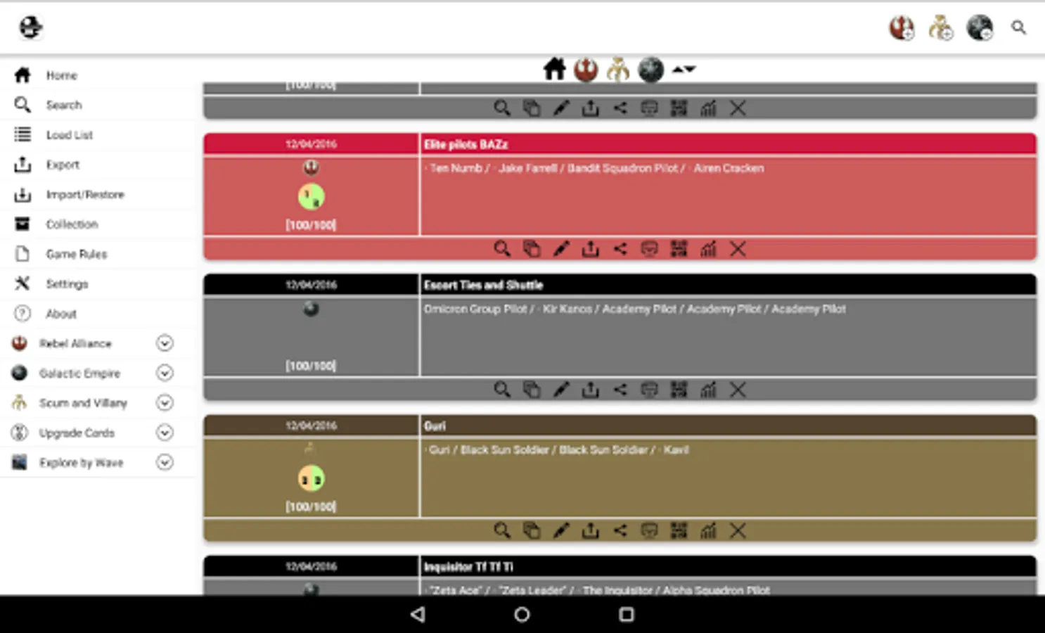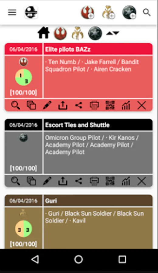 We can choose a faction and it will list all ships and pilots of that faction. We can pick any number of pilots, add upgrade cards, etc. By this way we can view the list value. The app allow us save and manage our lists for future consults, also share it on social networks or email.