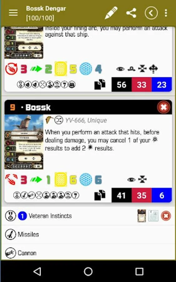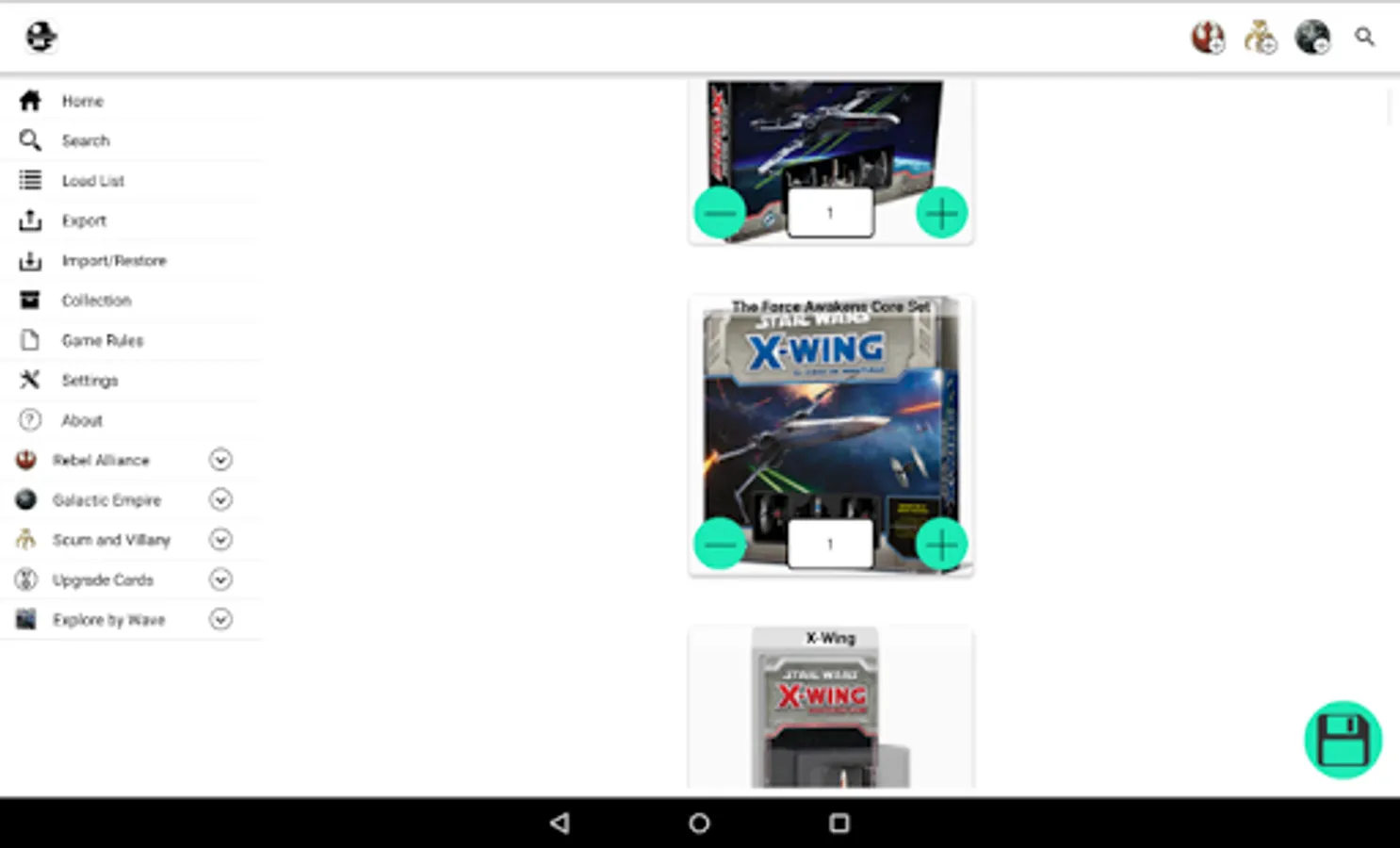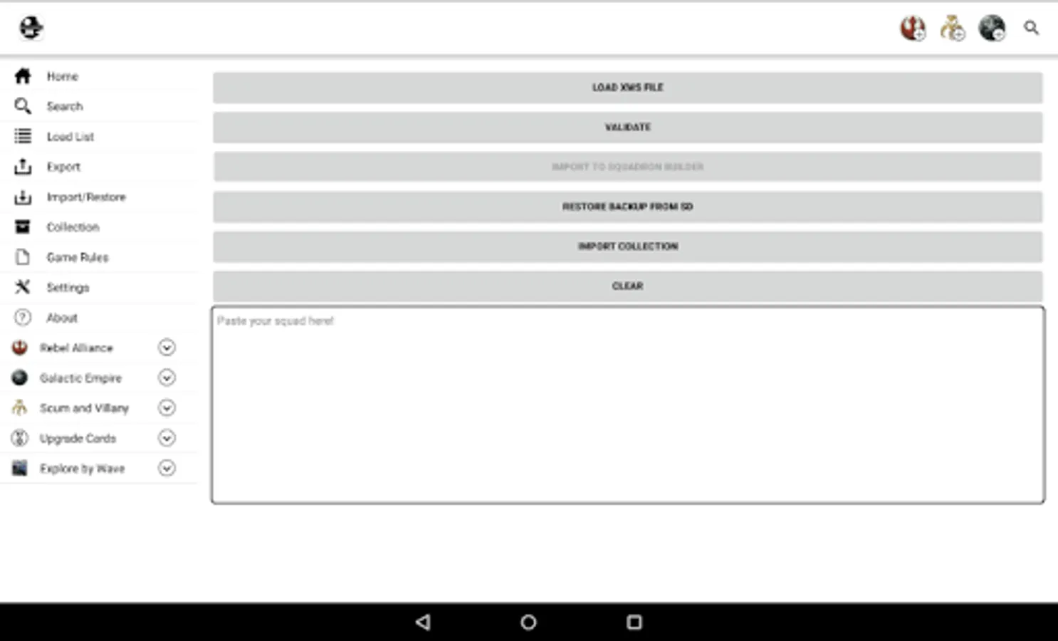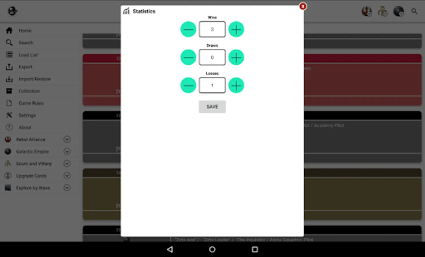 We can choose a faction and it will list all ships and pilots of that faction. We can pick any number of pilots, add upgrade cards, etc. By this way we can view the list value. The app allow us save and manage our lists for future consults, also share it on social networks or email.