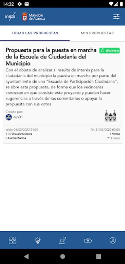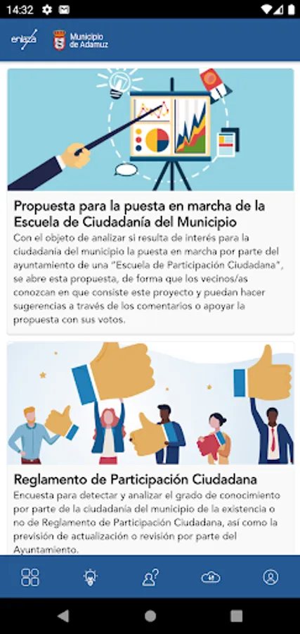 The purpose of the application is, on the one hand, to allow the participation of the citizens of the municipalities of the province of Córdoba in topics of interest through surveys and proposals, and on the other, to access information from the municipality, such as links and open data. .