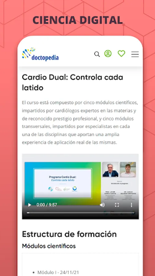 It also has current knowledge pills, live and deferred webinars and the most relevant medical news.