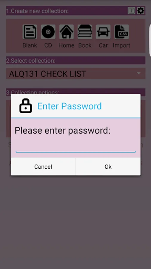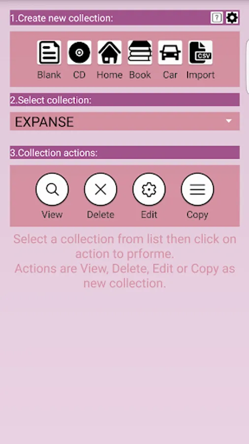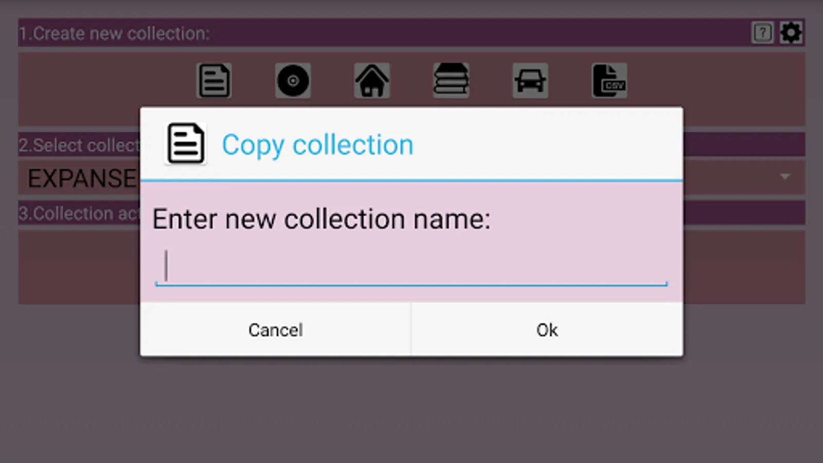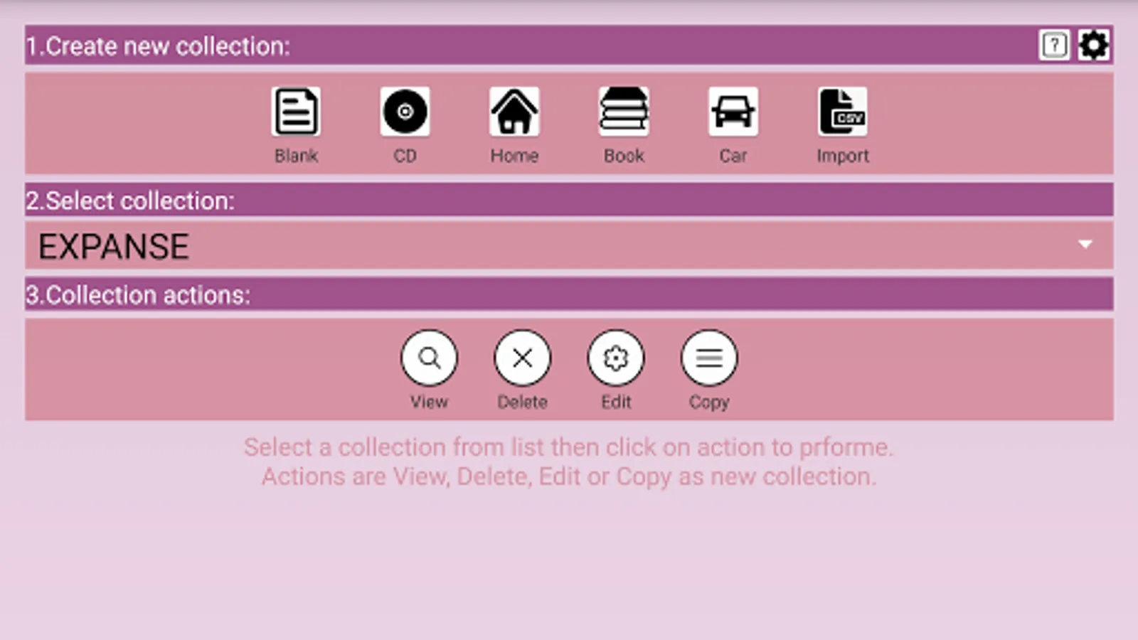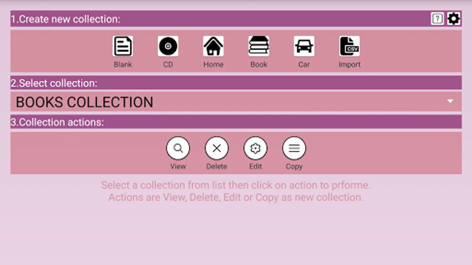 • Creating a new collection is easy jest click on the new collection icon or click on one of the templates provided (Software, House hold, Books, Car maintenance) or you can import a collection from CSV file.
