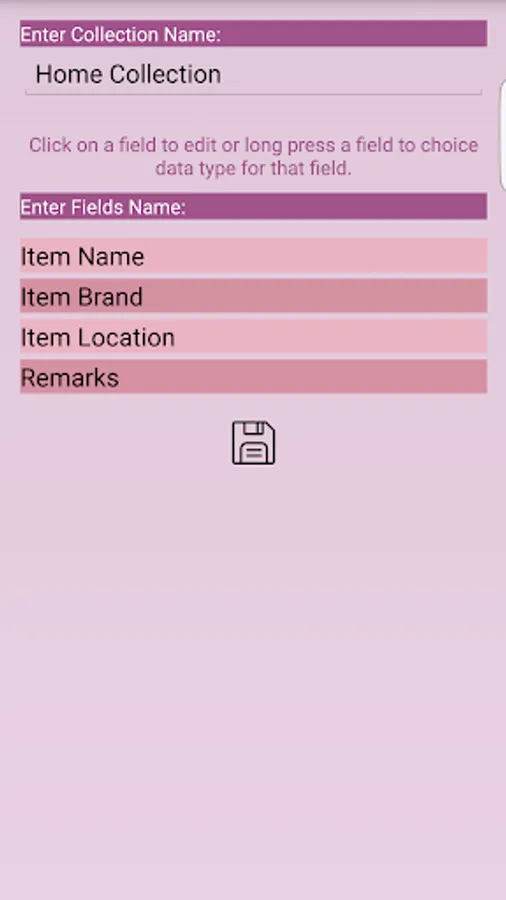 • Than you can edit the fields name and by long press on a field you can specified the data type for that field.