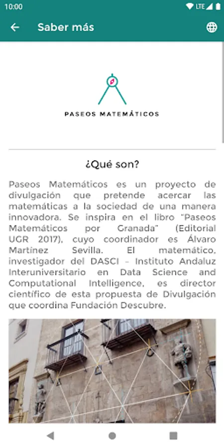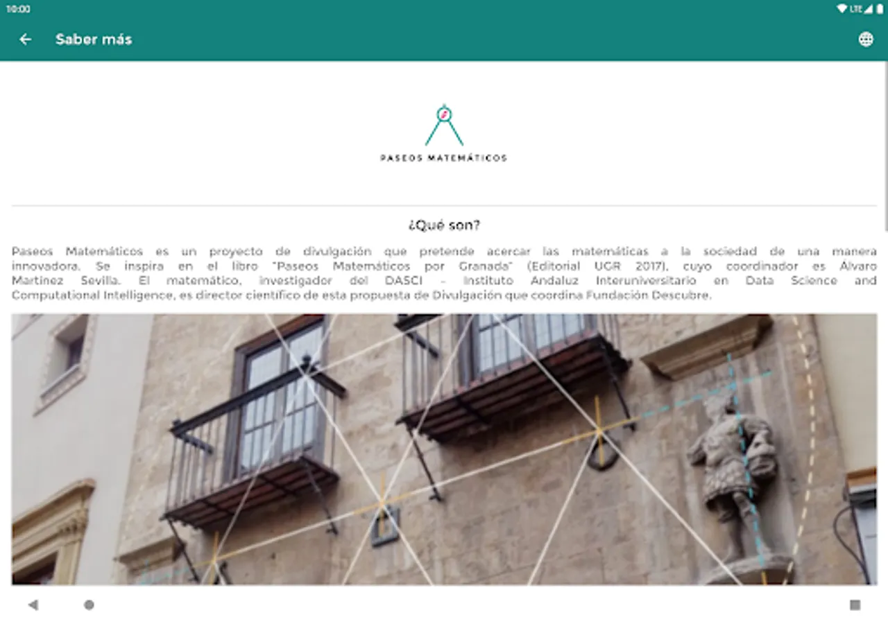 Walks Mathematics is a dissemination project that aims to bring mathematics closer to society in an innovative way. It is inspired by the book "Mathematical Walks through Granada" (Editorial UGR 2017), whose coordinator is Alvaro Martínez Sevilla. The mathematician, a researcher at the DASCI - Andalusian Interuniversity Institute in Data Science and Computational Intelligence, is the scientific director of this Disclosure proposal coordinated by Fundación Discover.