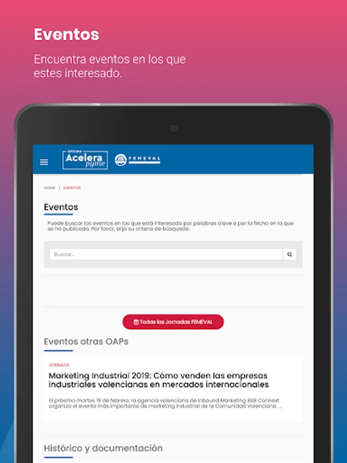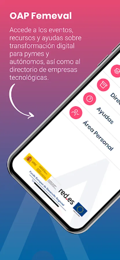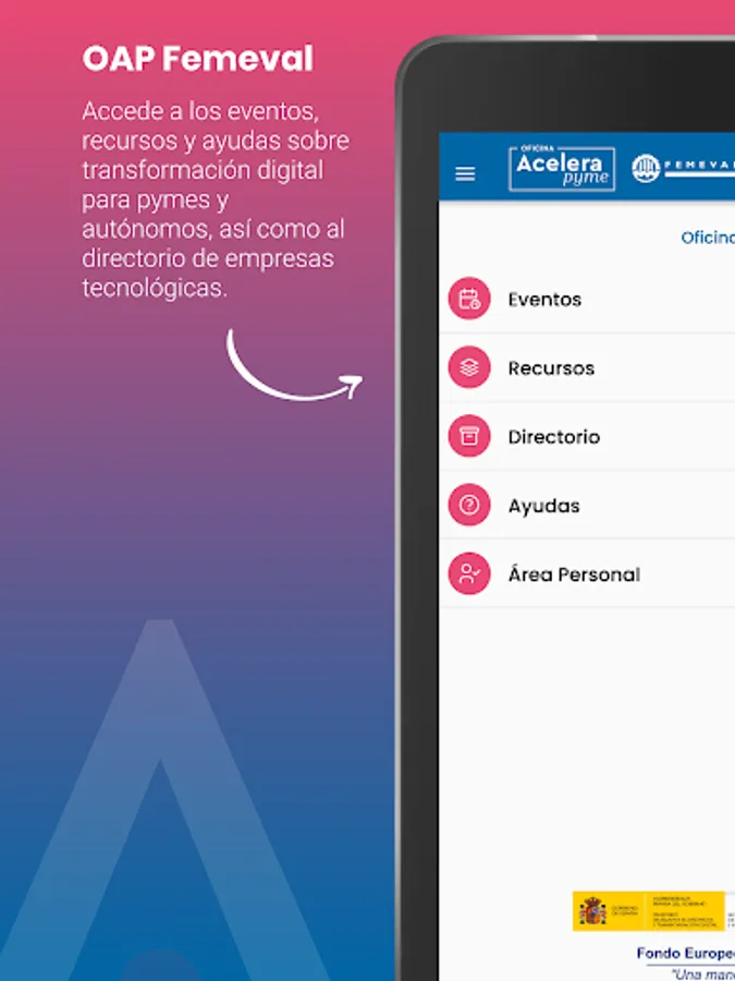 Through this app you will have access to all the information and activities of the FEMEVAL Acelera Pyme Office, current news, grants, conferences and events on innovative technologies and methodologies. Access to the directory of TEIC companies and to manuals, guides and awareness material. The Acelera Pyme Offices have been set up by Red.es, being co-financed with ERDF funds from the European Union.