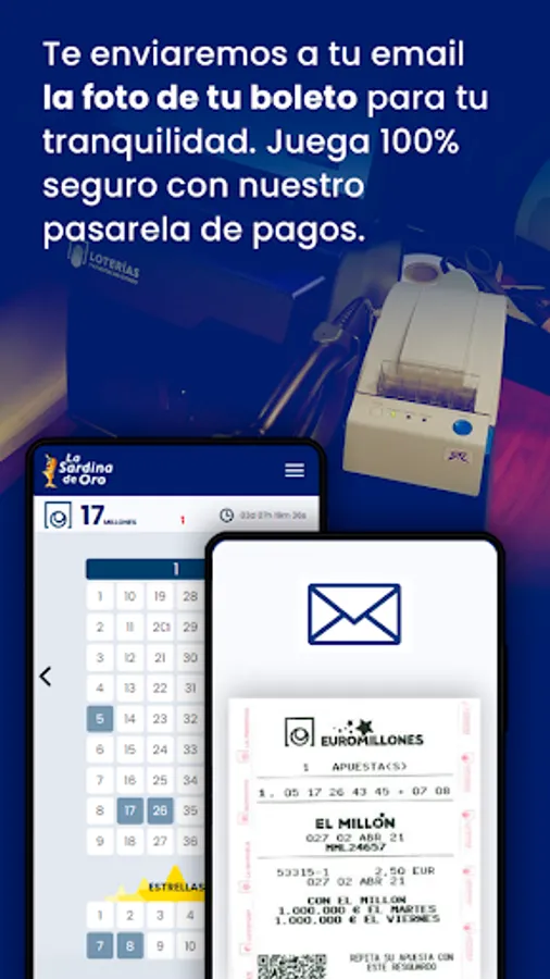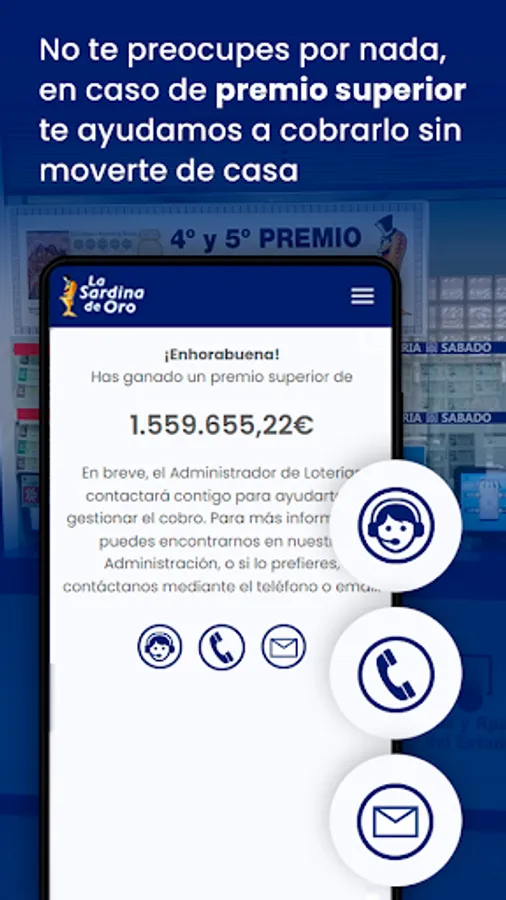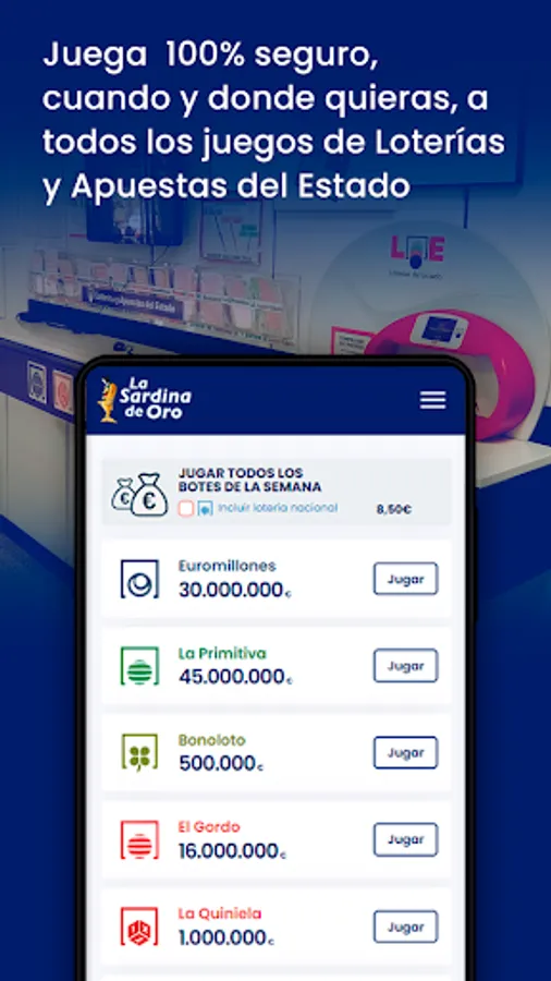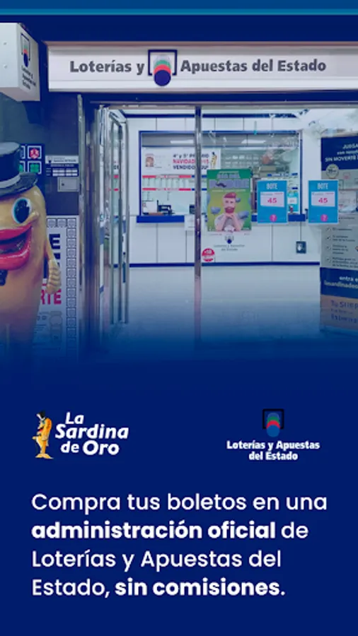 In La Sardina de Oro you will be able to play State Lotteries and Betting from the app, anytime and anywhere, without having to travel, with the same confidence and security that any Lottery administration offers. We are a long-standing administration that has distributed millions of euros in prizes in our long history. Also, for more peace of mind about your purchase, we will send you the photo of your scanned ticket every time you play!