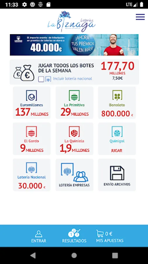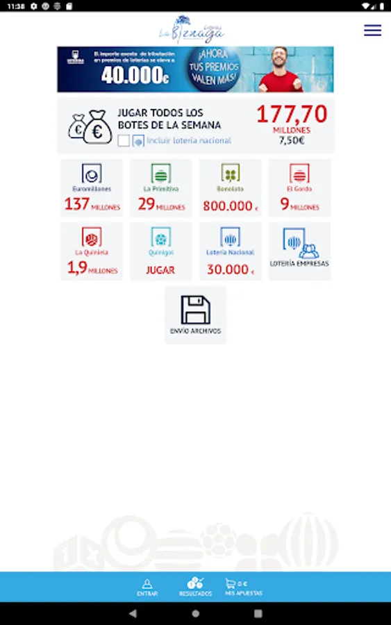 Remember, La Biznaga Lottery is the most reliable free app to place bets on Lottery, Quiniela, EuroMillions, Primitive Lottery, Children's Lottery, Christmas Lottery, BonoLoto and all the Lotteries and Bets of the State of Spain. May LUCK be with you!