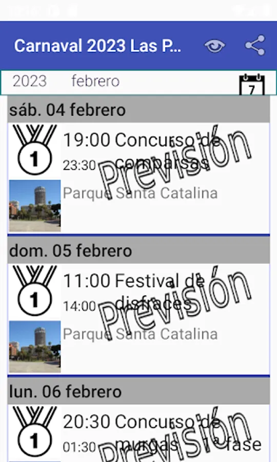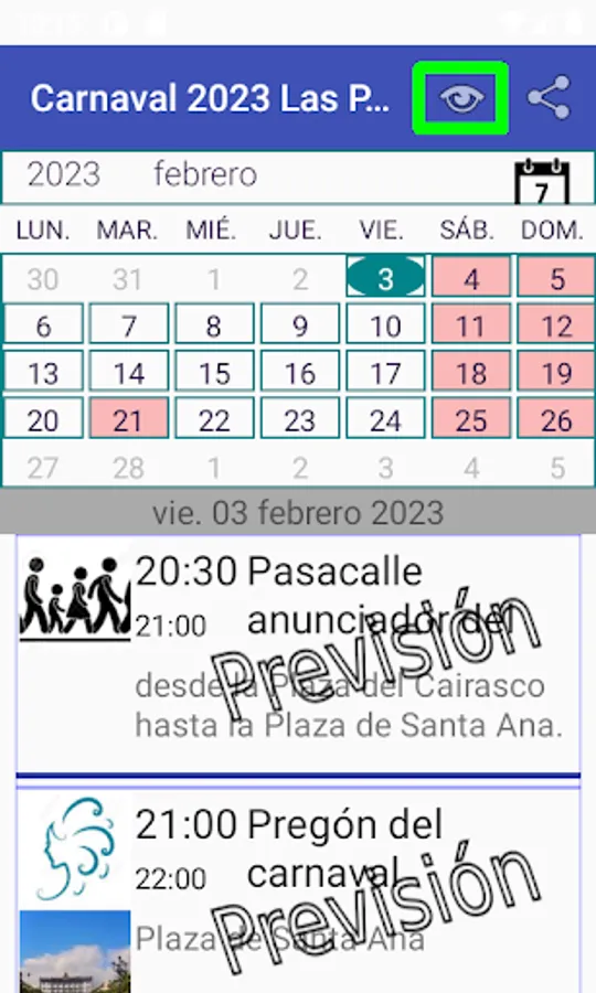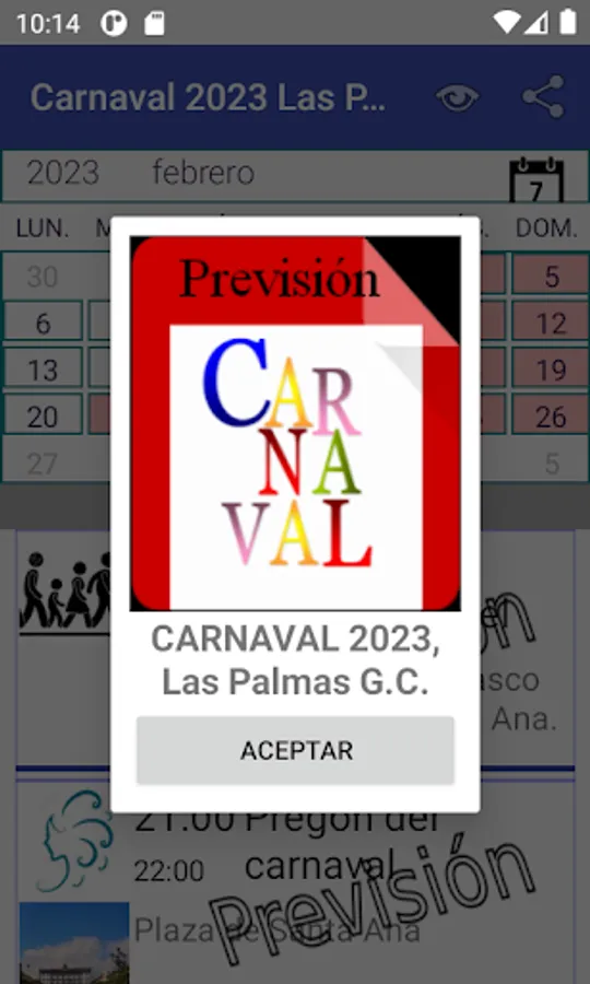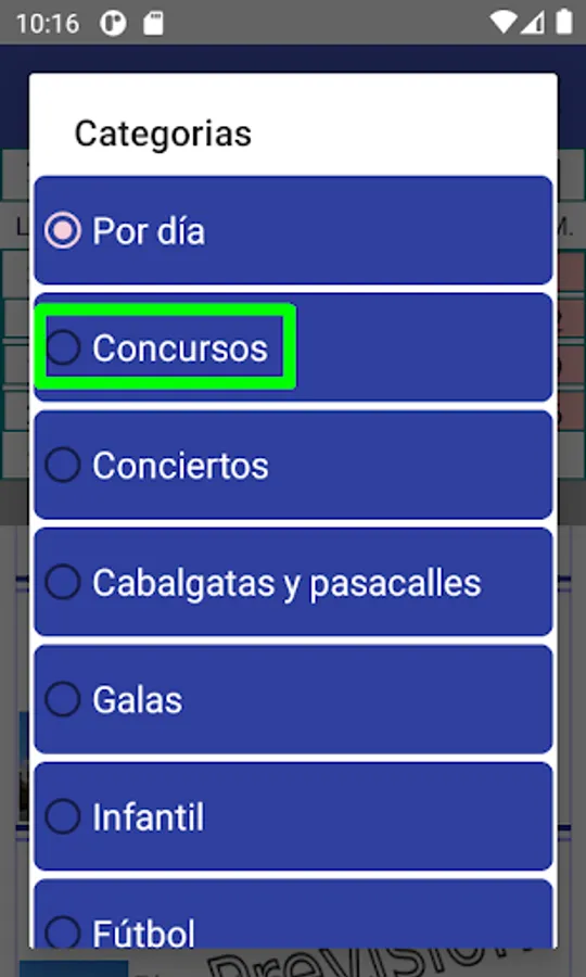 List by categories (By day, Contests, Concerts, Parades and parades, Galas, Children, Football, nights)