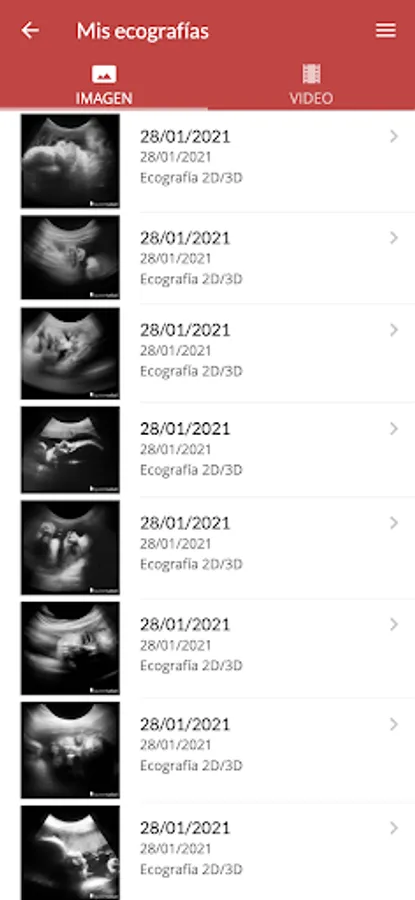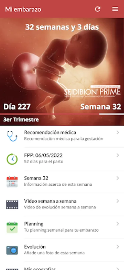 The App will know on what day and week of gestation, the patient is and display information, illustrations, 2D and 3D ultrasounds of the moment.