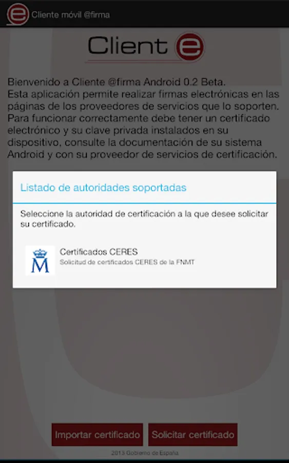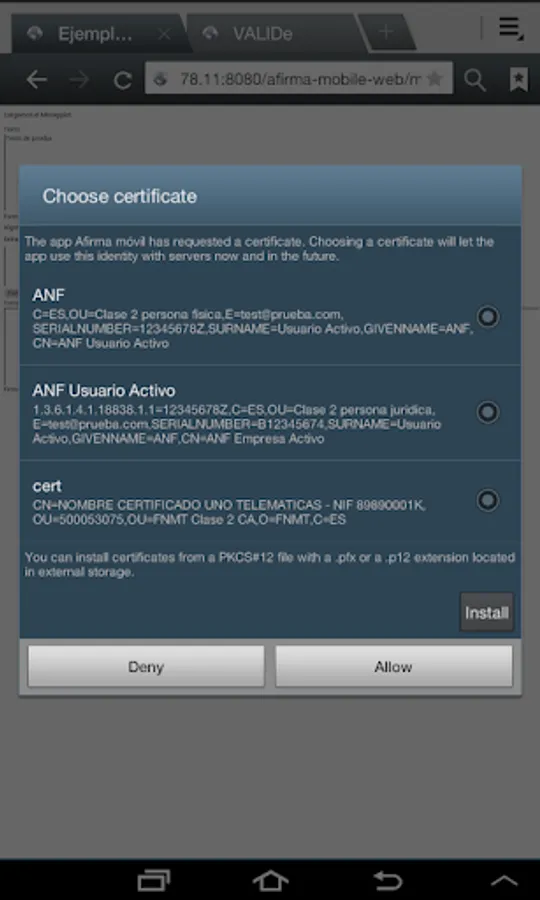 - You must have a recognized electronic signature certificate with their respective private key installed on your Android device. Consult the documentation for your operating system and its certification service provider to obtain this certificate and how to install this.