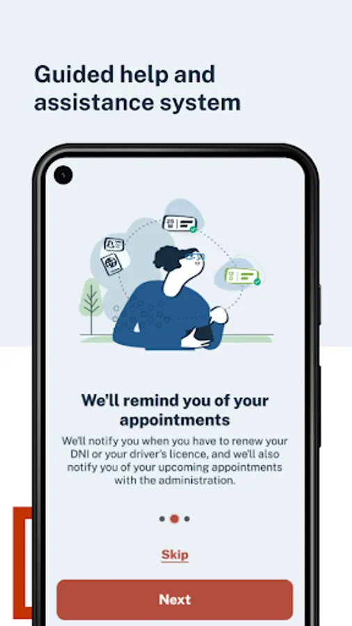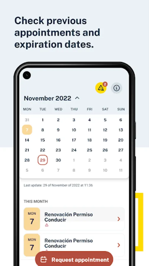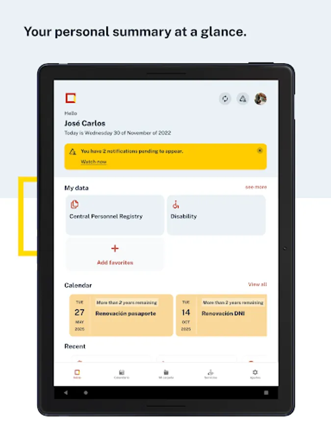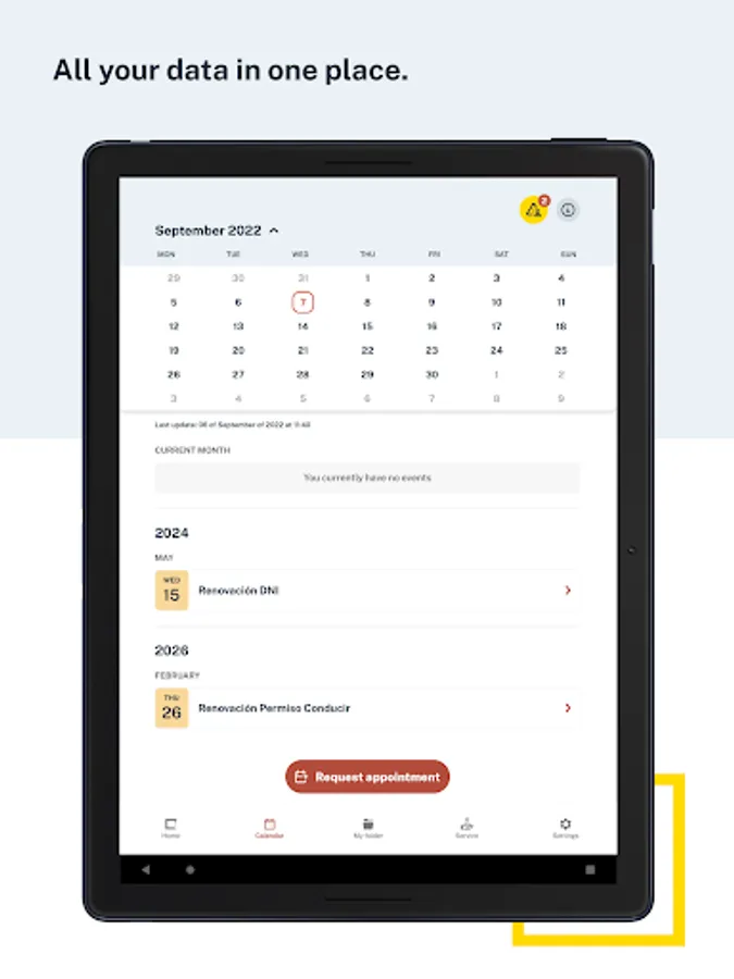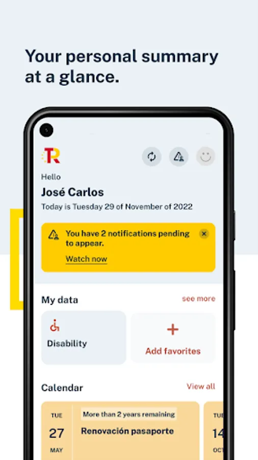 Calendar, to display your alerts regarding pending procedures with the Administration (DNI expirations, their electronic certificates, Passport, Driving License, ITVs) and your previous appointments with different administrations such as for the issuance of documentation by the Dirección General de la Policía (DNI, Passport, TIE), immigration appointments, a large number of registration assistance offices of various ministries, all government delegations and sub-delegations, civil registries and judicial offices, and other agencies that will be gradually incorporating.