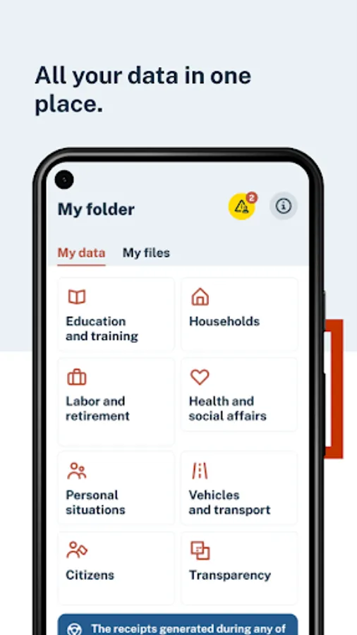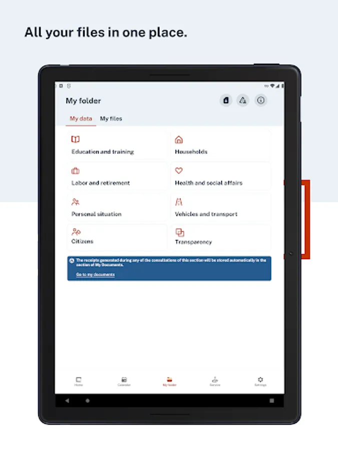 - My data. Consultation of personal data from different state, regional and local administrations, such as: social benefits (paternity, maternity, retirement, minimum vital income, etc.) and the history of the last year, real estate, driving license points, vehicles and ITVs, university and non-university qualifications, non-existence of criminal records, large family status and disability, registration, university enrollment, degree of dependency, working life, etc. In addition to queries, in the cases agreed with the competent body, this data can be downloaded in PDF or QR format to a wallet on the device. This section will be constantly growing.
