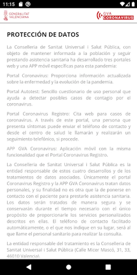 The Ministry of Universal Health and Public Health is responsible for and author of the information displayed in the application, and also guarantees the privacy and protection of your data (http://coronavirusautotest.san.gva.es/proteccion-datos- en.html). Likewise, the Ministry guarantees that personal information will be stored and used in a sufficiently secure way, for the time necessary and only to provide you with the personalized services described above.