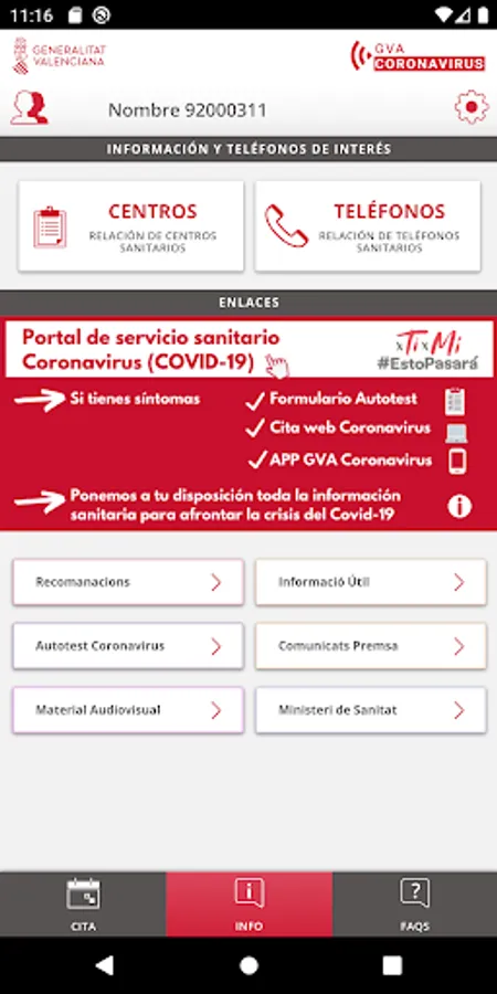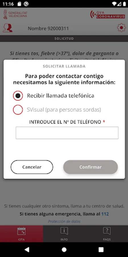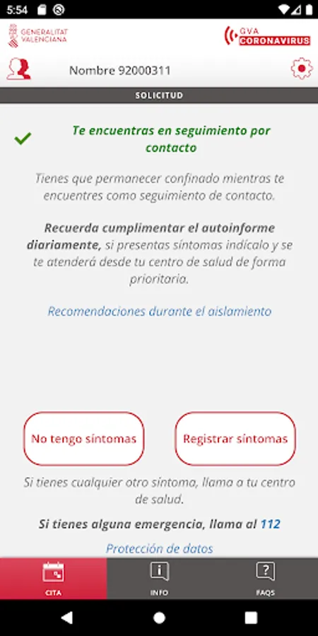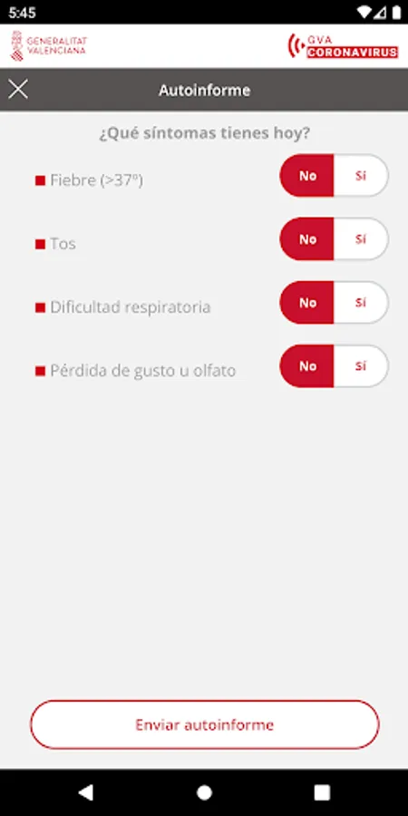 Official mobile application of the Conselleria de Sanitat Universal i Salut Pública to request an appointment with your health center in case of presenting clinical symptoms compatible with COVID-19 infection.