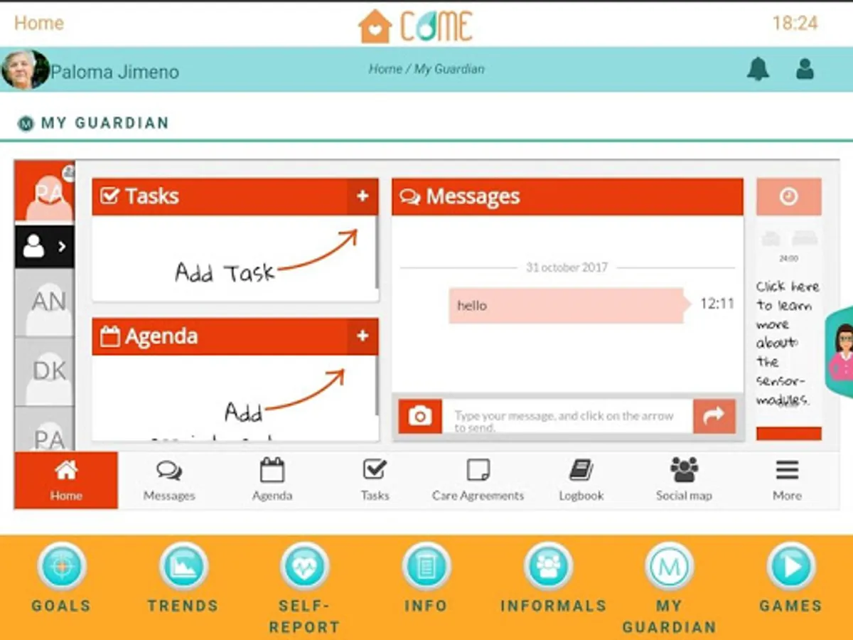 - Informal caregivers. CoME enables informal caregivers to know better current senior’s health status (if allowed by the senior). In addition, the CoME platform provides a comprehensive and centralized online community of caregivers. Throughout this community, informal caregivers can access useful guidelines on good practice and tutorials as well as share experiences through AR devices. Finally, this platform allows informal caregivers to contact each other for occasional care tasks through a match-making search engine.