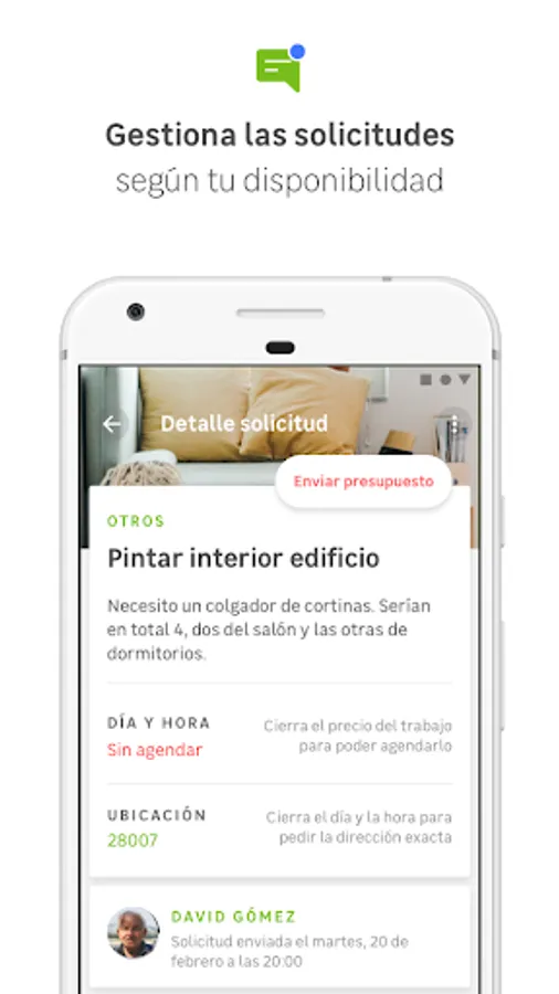 Through Hogami you will receive requests for painting work, flooring, handyman, installations, plumbing, electricity, decoration, moving services, cleaning, gardening and any service related to maintenance and renovation of spaces.
