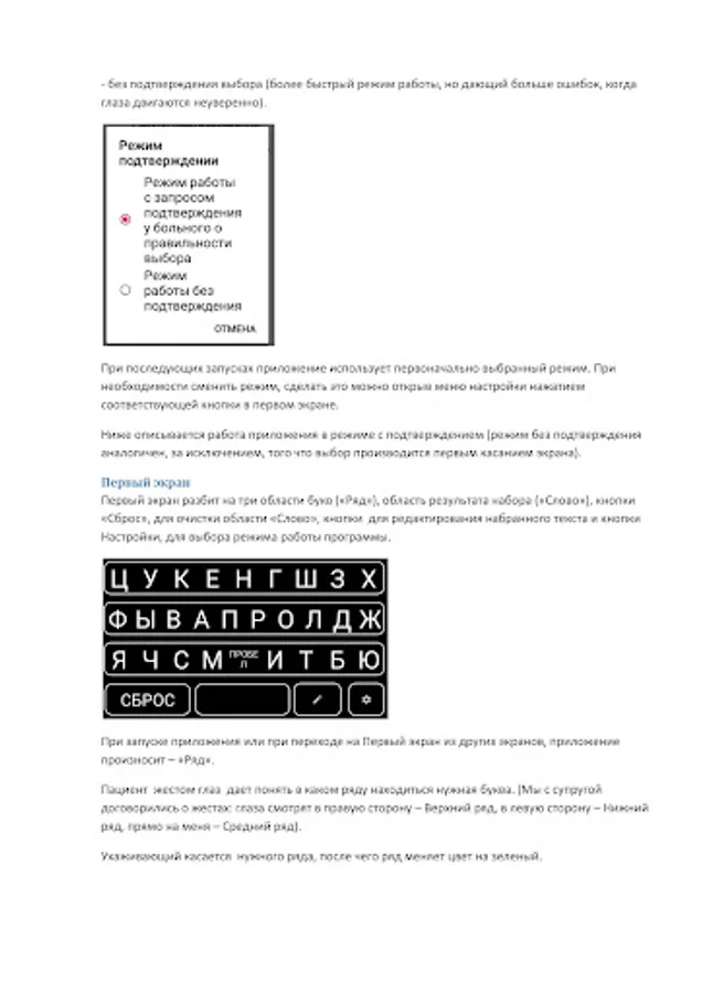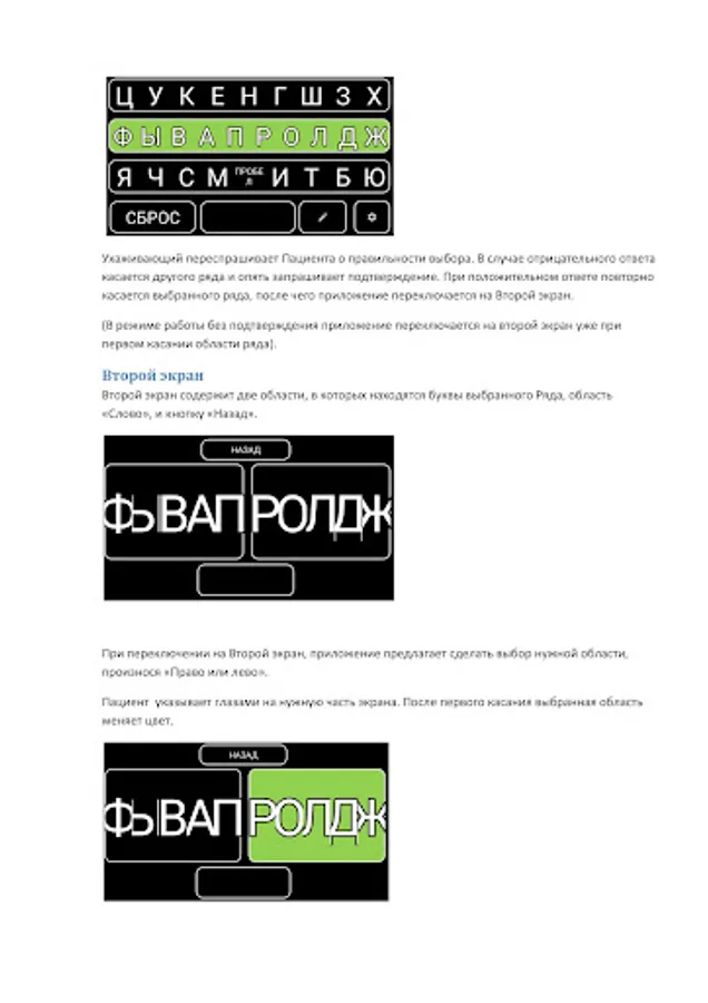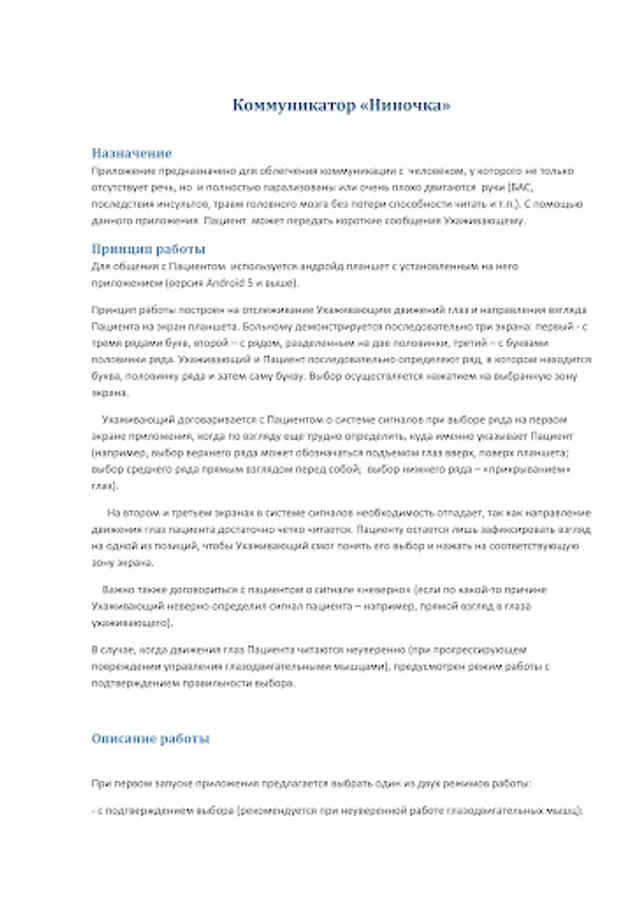 The application is designed to facilitate communication with a person who is not only speechless, but also completely paralyzed or moving his hands very poorly (ALS, the consequences of strokes, brain injuries without loss of reading ability, etc.).