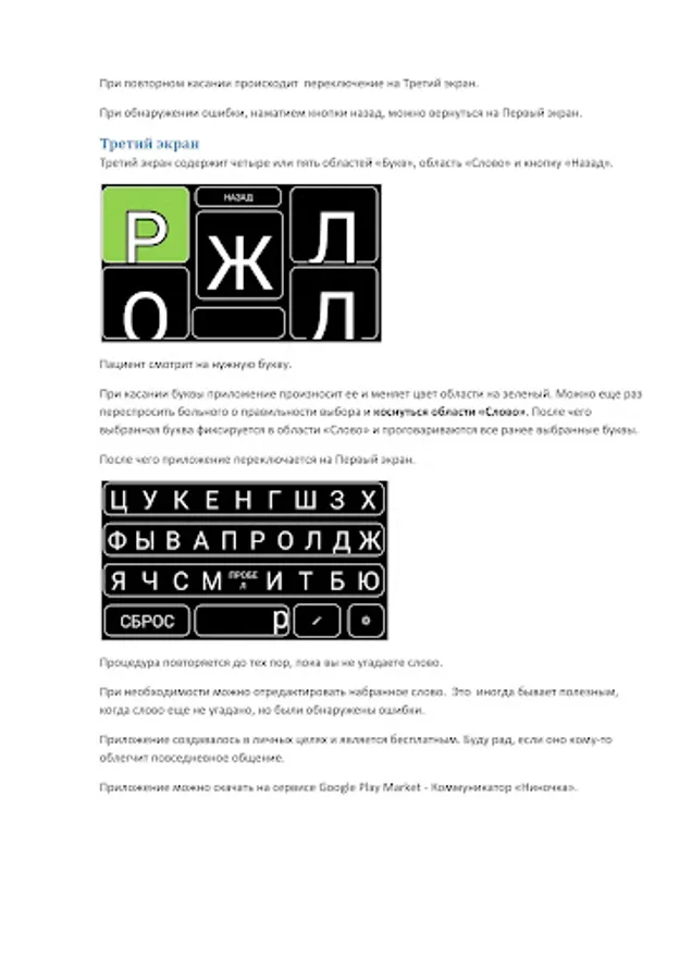 The application voices the caregiver the result of the selection, which allows you to work "blindly" without turning the screen to yourself. When the desired letter is found, the caretaker touches the set area