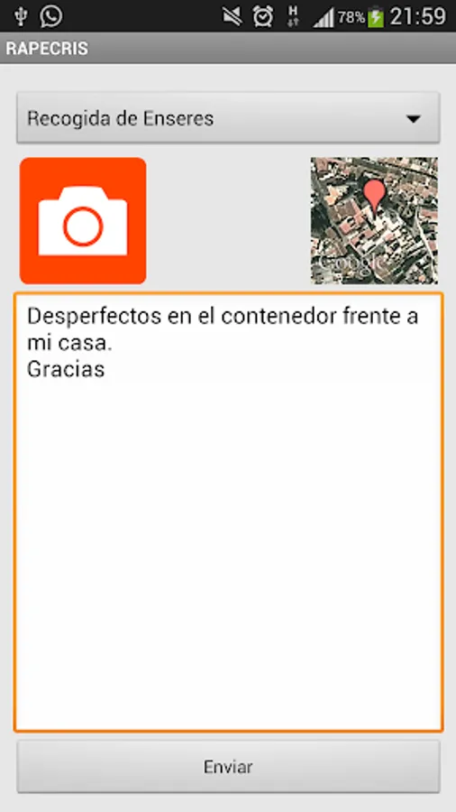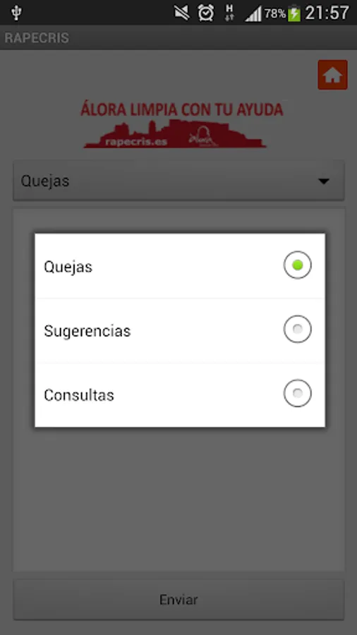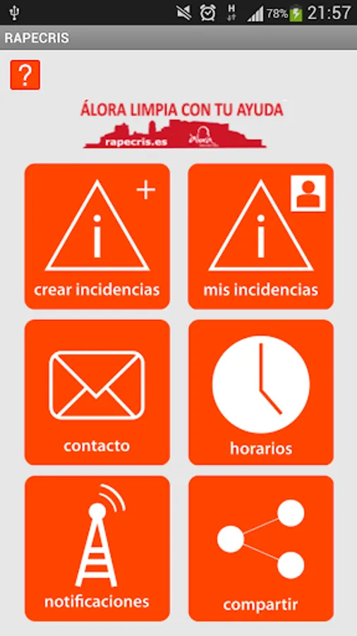 Through this application, the neighbors can communicate Alora RAPECRIS company, responsible for the provision of municipal MSW collection, to detect any incidence in the municipality, at any time and from anywhere, encouraging participation citizen in achieving a clean and welcoming city for all.