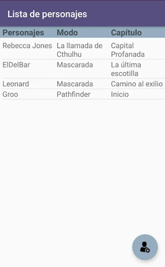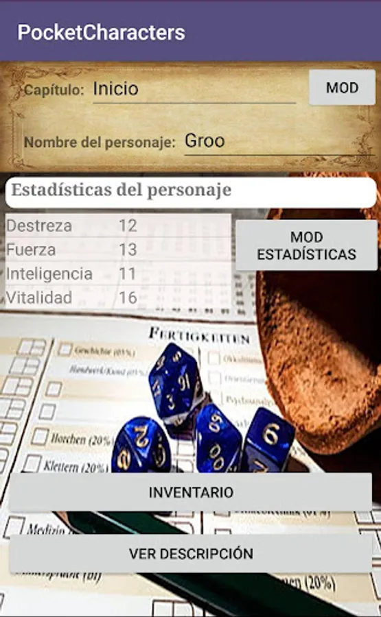 A character will have a name, a chapter (Game Name), a series of statistics defined by the selected game mode, a description and an inventory of objects.