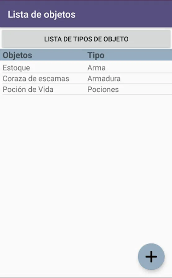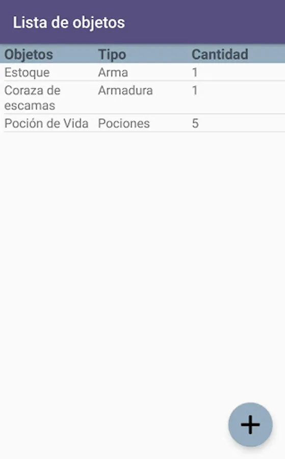 The objects will have a type, a name and a description. These assigned to a character will also have an amount.