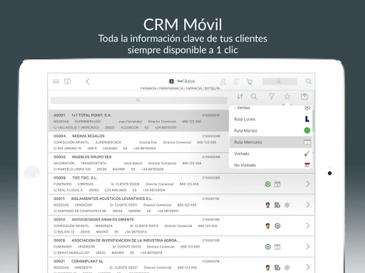 Improving customer management allows you to better understand their behavior and anticipate their needs. Finding customers close to the geo-locator, reviewing the key information on their records, targeting objectives and reporting on-site business visits is simple and fast with our inaCátalog commercial software and inaCátalog mobile sales CRM. Total effectiveness!