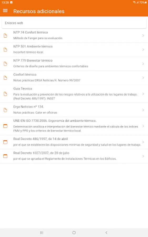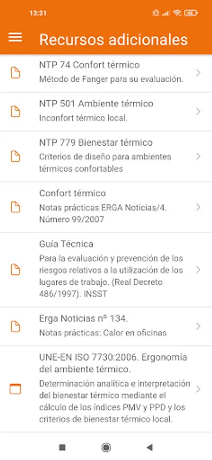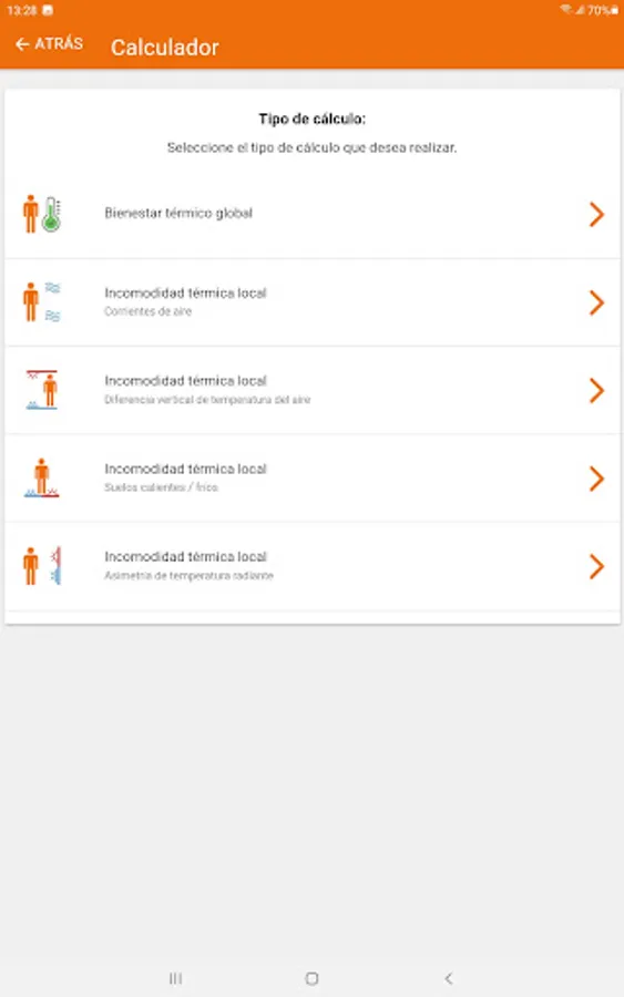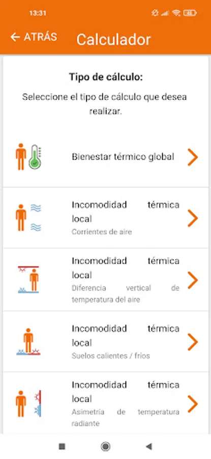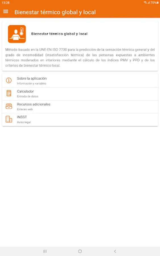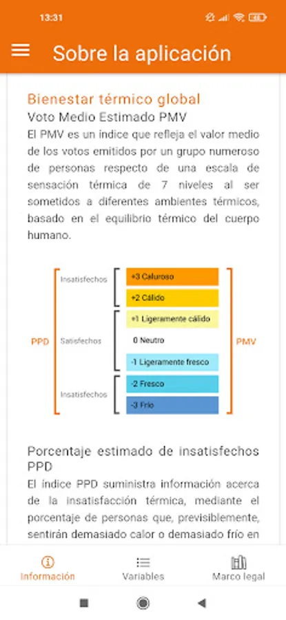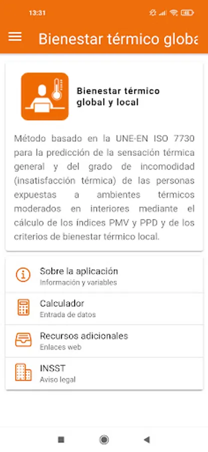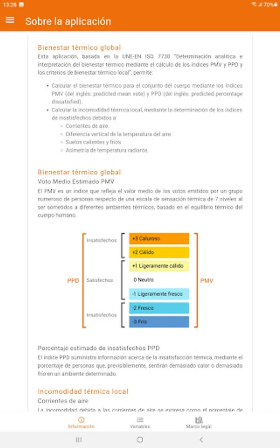 This application, based on the UNE-EN ISO 7730 "analytical and interpretation of thermal comfort Determination by calculating the PMV and PPD indices and criteria local thermal comfort" to calculate the thermal comfort for the whole body by indices PMV (English: Predicted mean vote) and PPD (English: percentage Predicted dissatisfied) and local thermal discomfort, by determining indices dissatisfied due to: airflows, vertical temperature difference of the air hot and cold soils or radiant temperature asymmetry.