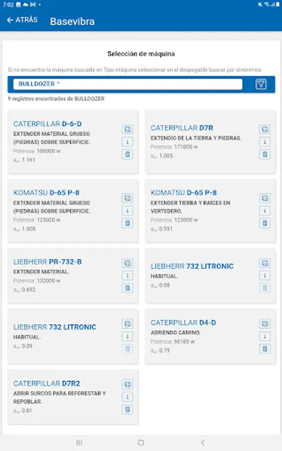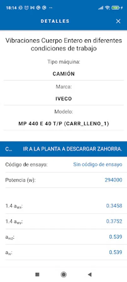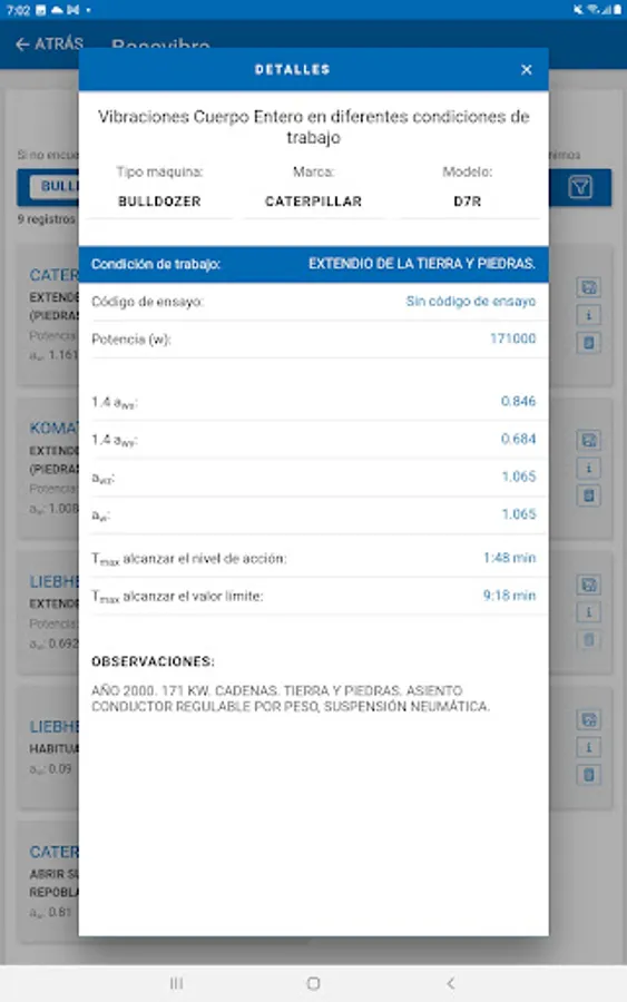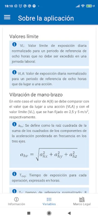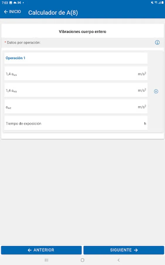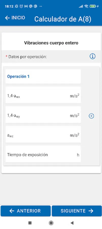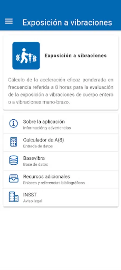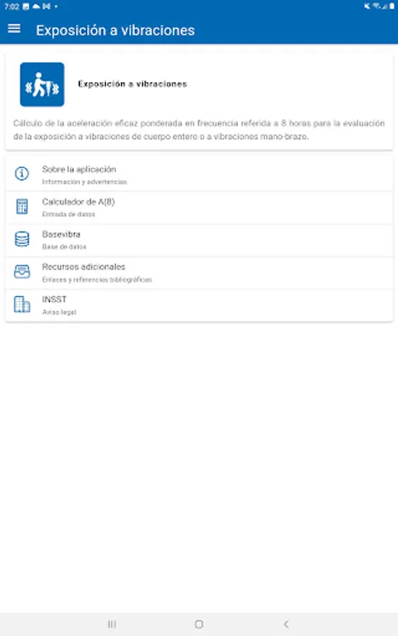 This application allows the calculation of the weighted rms acceleration often referred to 8 hours to assess exposure to hand-arm vibration according to UNE-EN ISO 5349-2 (hand-arm vibration) and UNE-ISO 2631-1 (vibrations whole body)