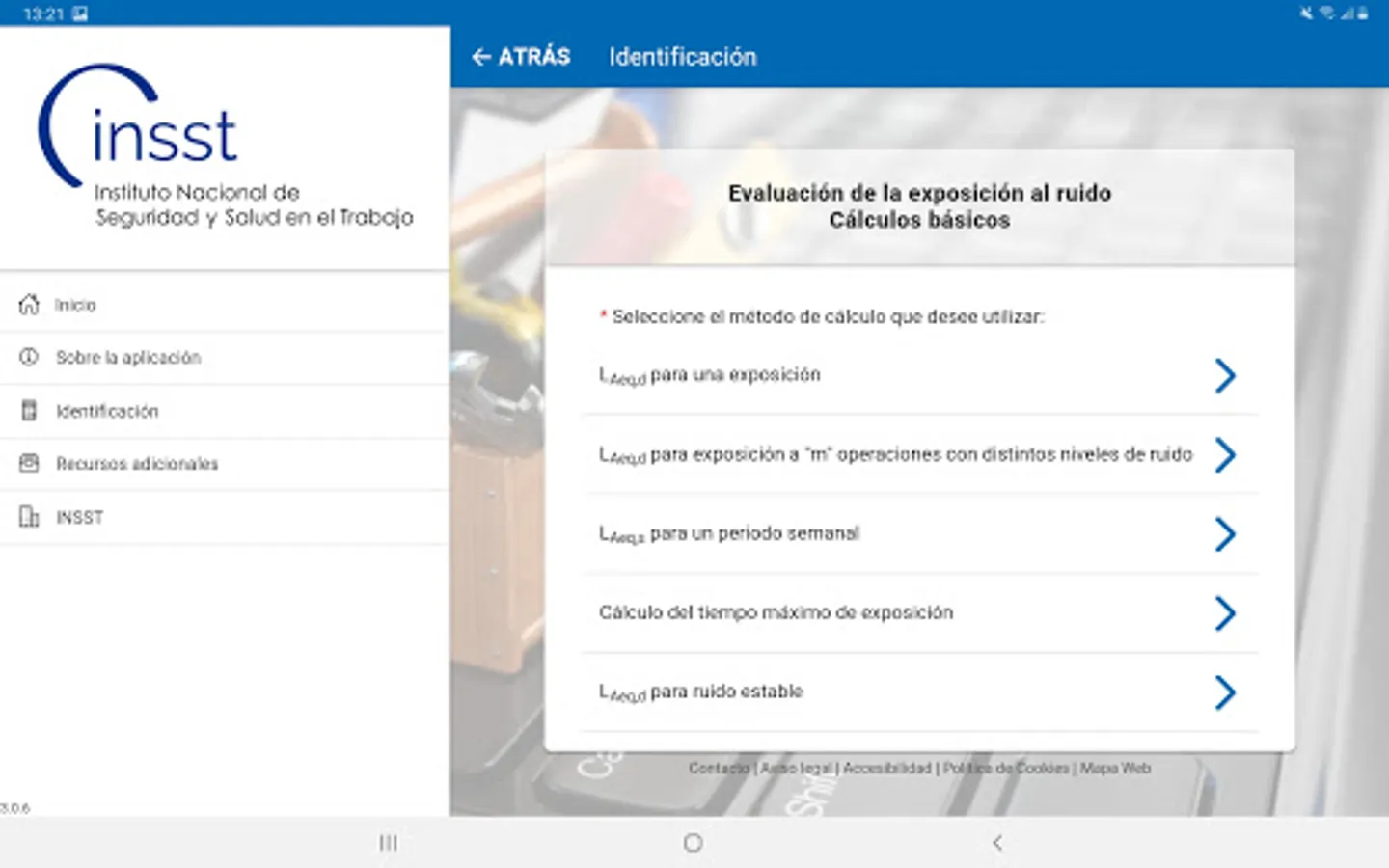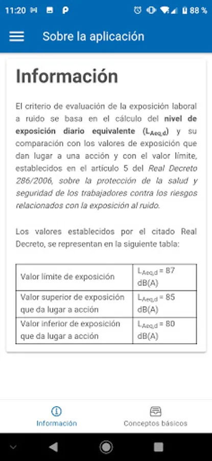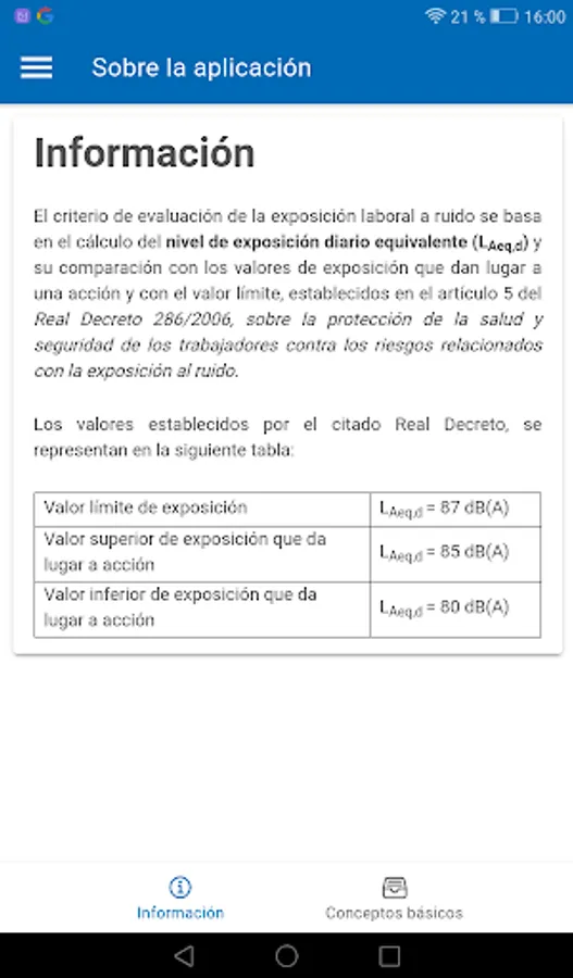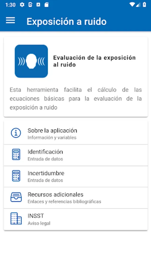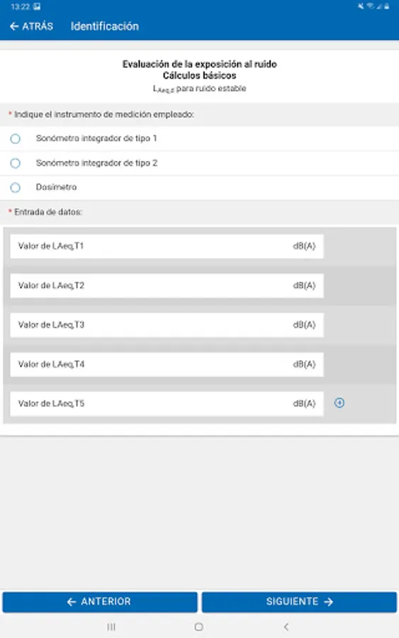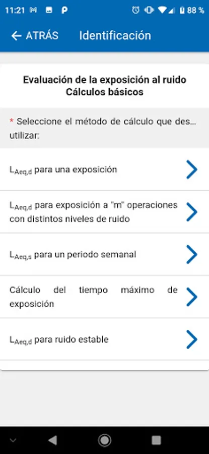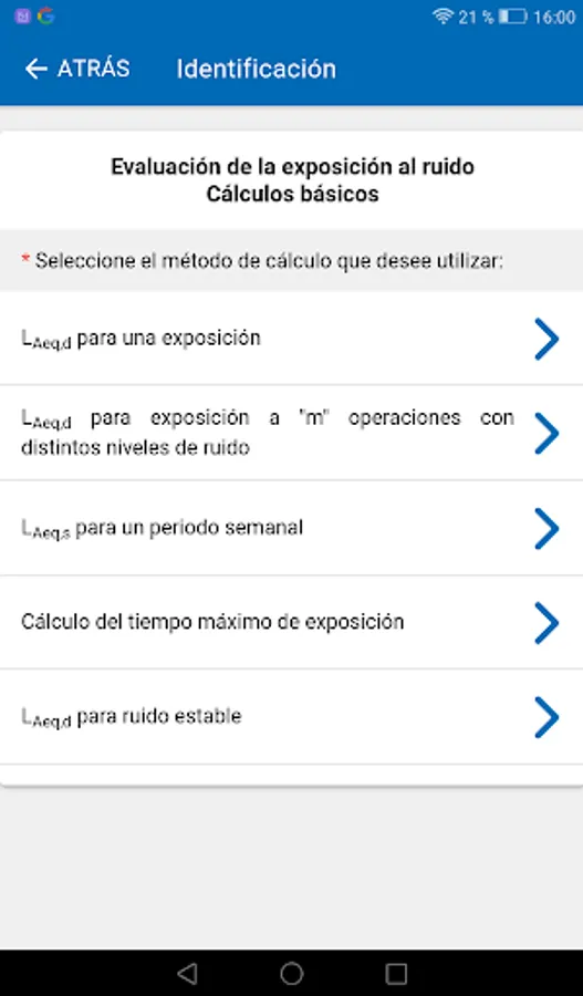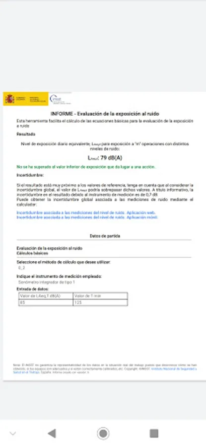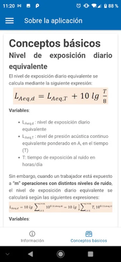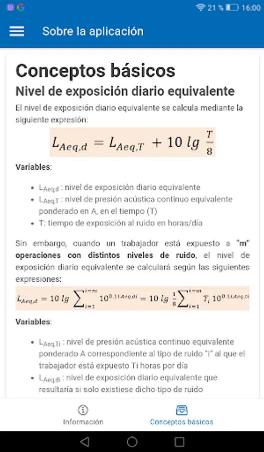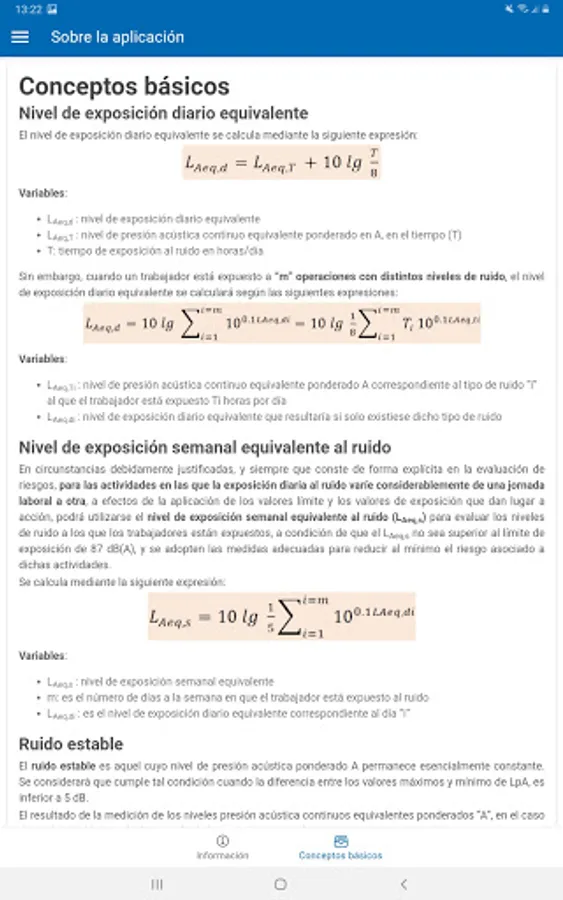 Calculation of the basic equations for the evaluation of noise exposure: equivalent daily level for one exposure or m operations with different noise levels, weekly equivalent level, maximum exposure time and equivalent level for stable noise