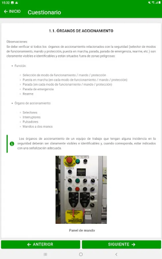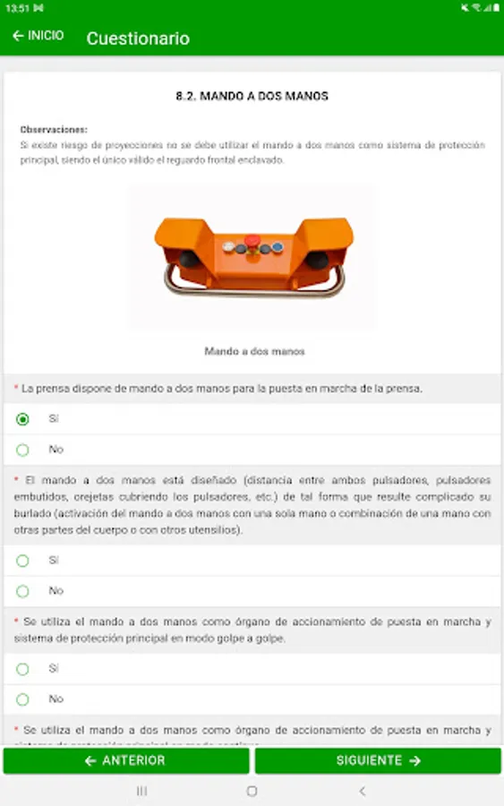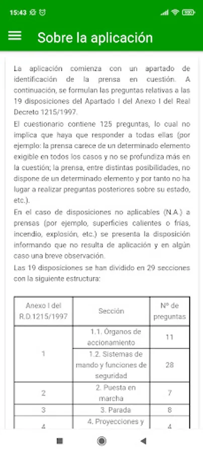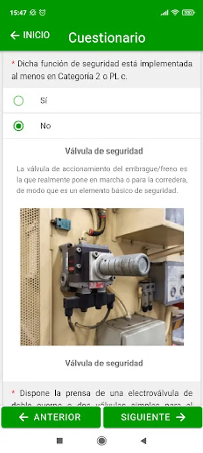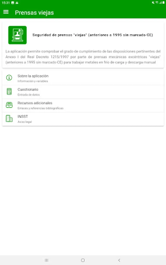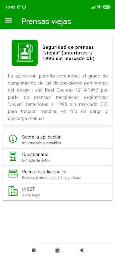 The Safety of "old" presses application allows checking the degree of compliance with the relevant provisions of Annex I of Royal Decree 1215/1997 by "old" eccentric mechanical presses (prior to 1995 without CE marking) for cold metal working of manual loading and unloading.