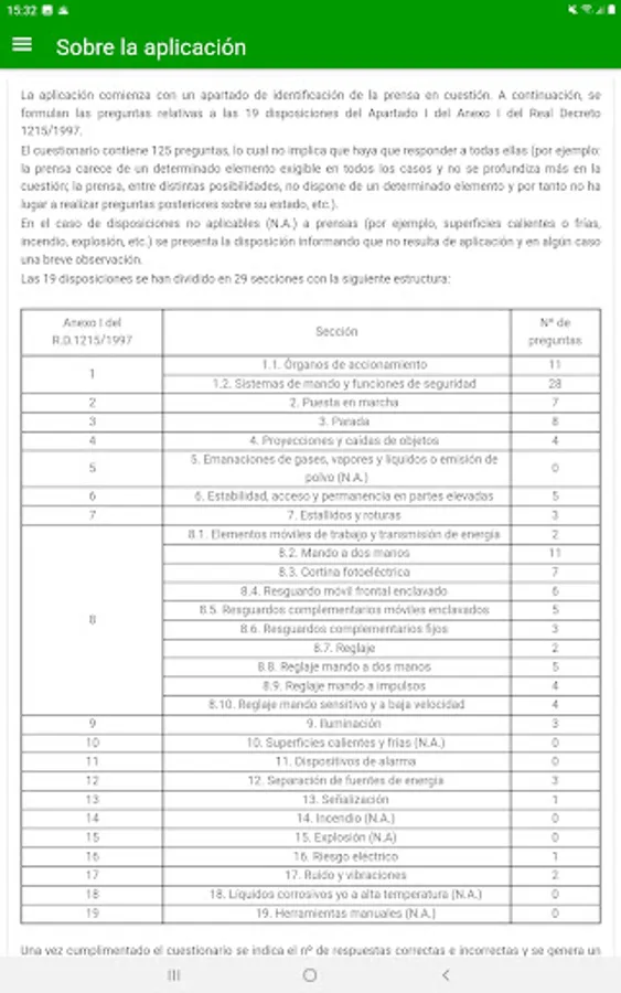 It begins with a section identifying the press in question. Next, the questions related to the 19 provisions of Section I of Annex I of Royal Decree 1215/1997 are formulated.