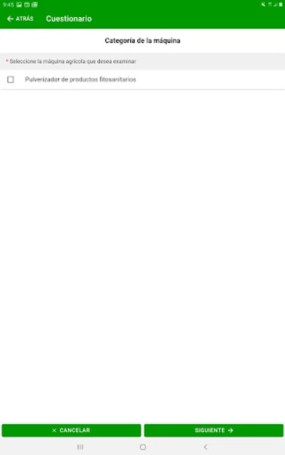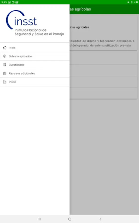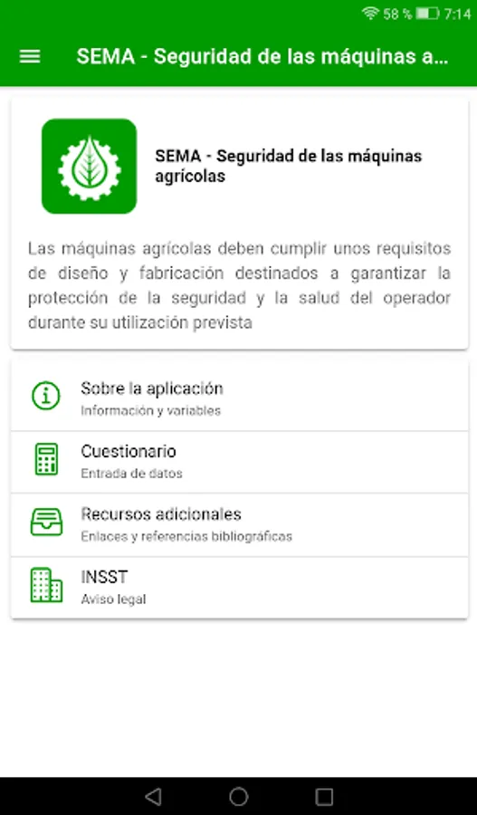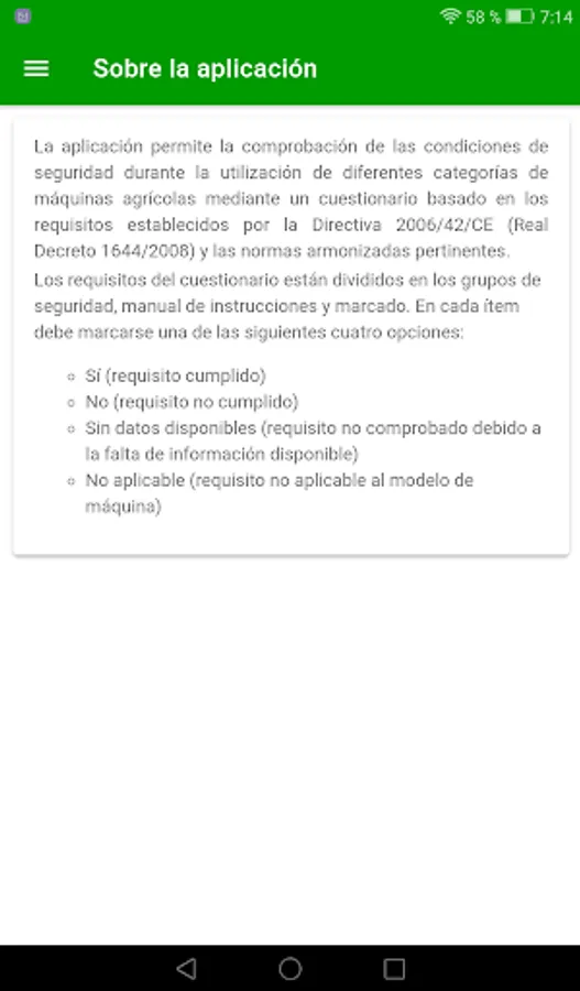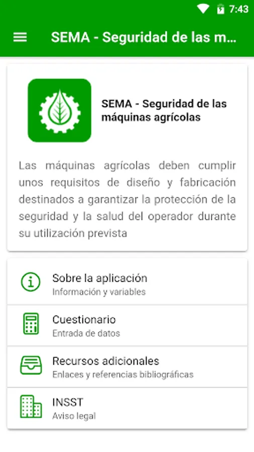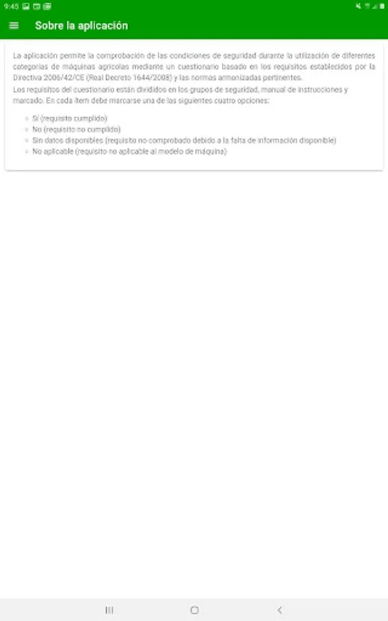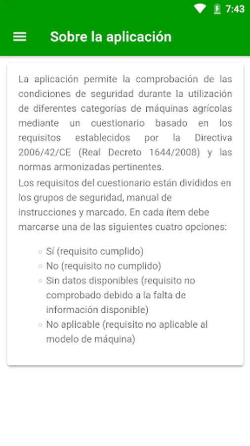 The application allows the verification of the safety conditions during the use of different categories of agricultural machines by means of a questionnaire based on the requirements established by Directive 2006/42 / EC (Royal Decree 1644/2008) and the relevant harmonized standards.