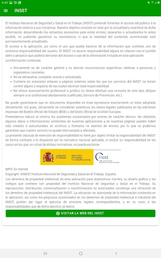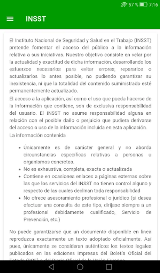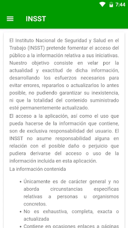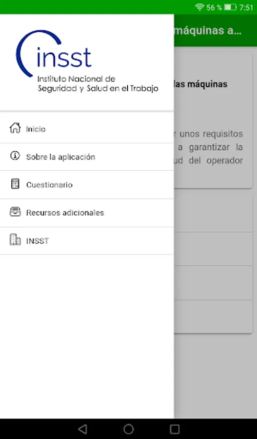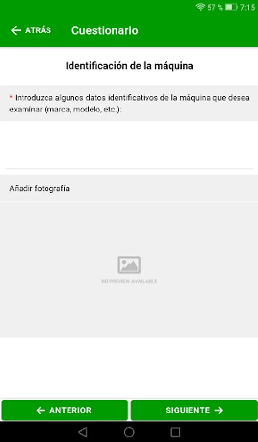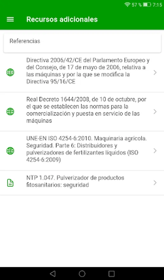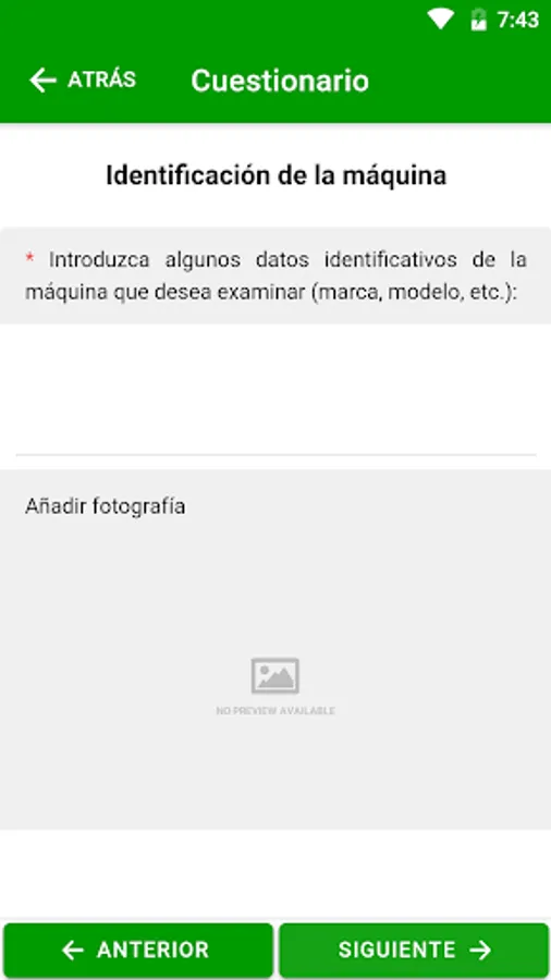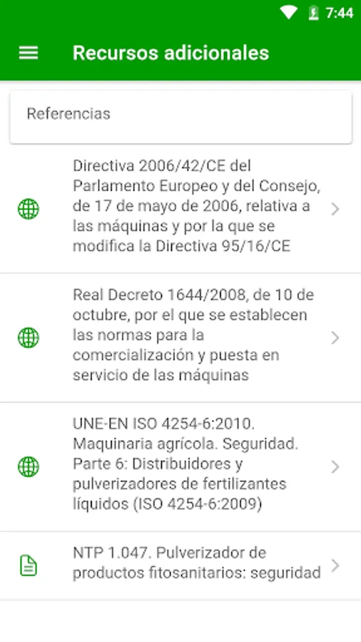 The application allows the verification of the safety conditions during the use of different categories of agricultural machines by means of a questionnaire based on the requirements established by Directive 2006/42 / EC (Royal Decree 1644/2008) and the relevant harmonized standards.
