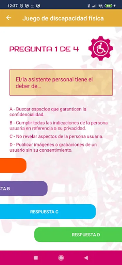 Get close to disability is a project that includes three different awareness workshops: "Vía-Vida", "Put yourself in my shoes" and "Sports and disability". These workshops are normally held in person, but in the situation of social distancing that we live in today, it is not advisable to carry out awareness sessions in schools, universities and / or organizations of a similar nature to which we used to go. For this reason, an accessible APP called "get closer to disability" is being developed, which allows reaching the target audience through new technologies.