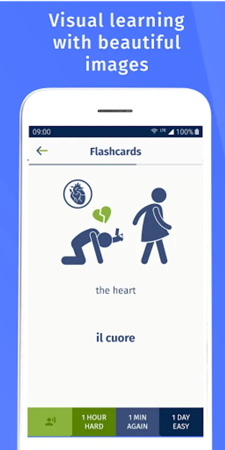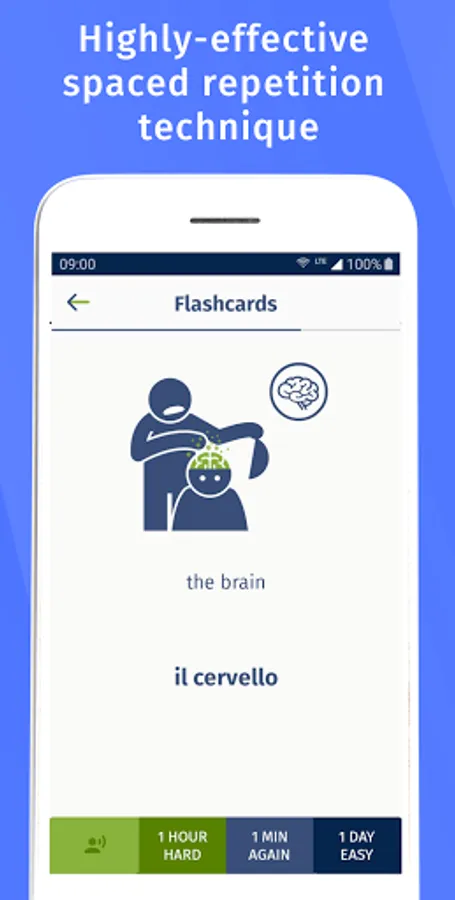 The memory cards use the principle of spaced review in your Italian learning, so the cards you already know will appear less, while the ones you find more difficult will appear more often.