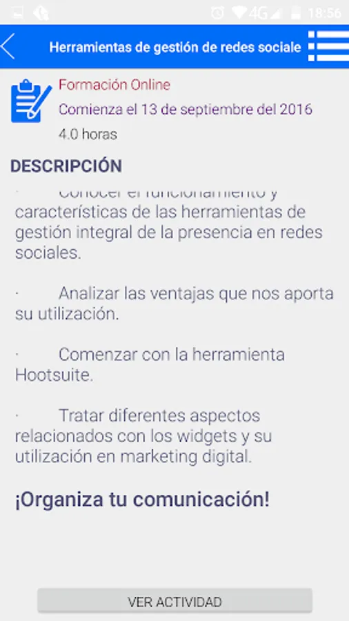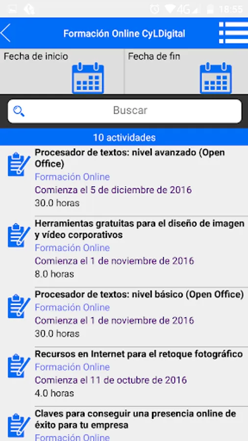 Application for consulting training activities given by the D.G CyL Digital Telecommunications initiative of the Ministry of Development and Environment of the Junta de Castilla y León.