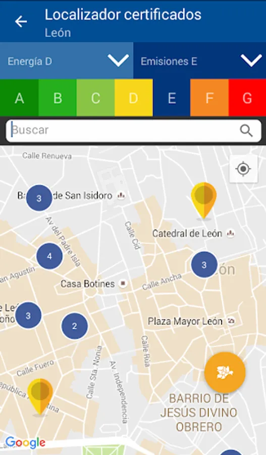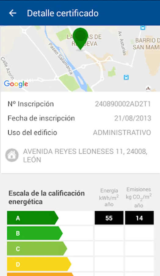 - Geographic location display energy certificates buildings Castile and Leon, with the energy rating CEREN registered in registration.