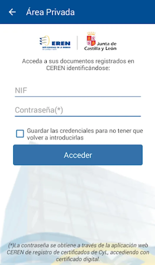 To access the private area your NIF / NIE and password obtained through the CEREN web application, accessing digital certificate is used.