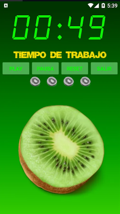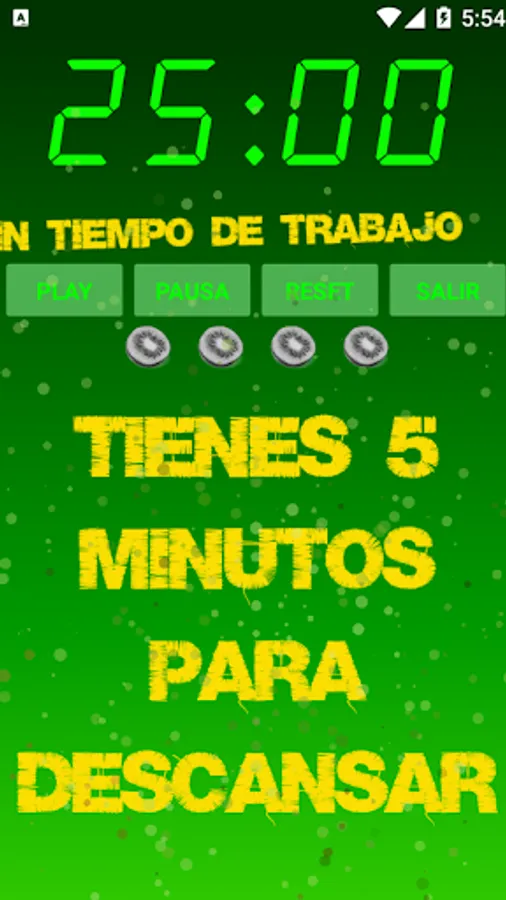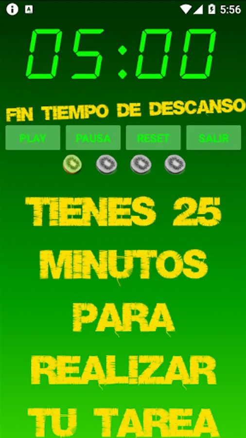 5. Upon reaching 5 minutes, another alarm will sound and the screen will indicate that the rest time has ended, another 25-minute work interval will automatically begin, so on until the 4 kiwis of 25 minutes are consumed, then the last rest interval it will be 15 minutes and once finished, the cycle will start again from the beginning.