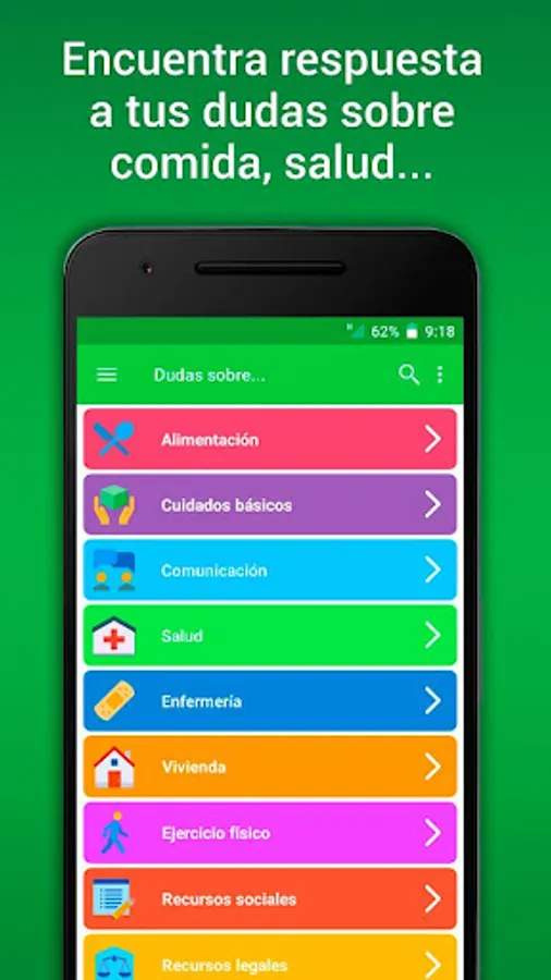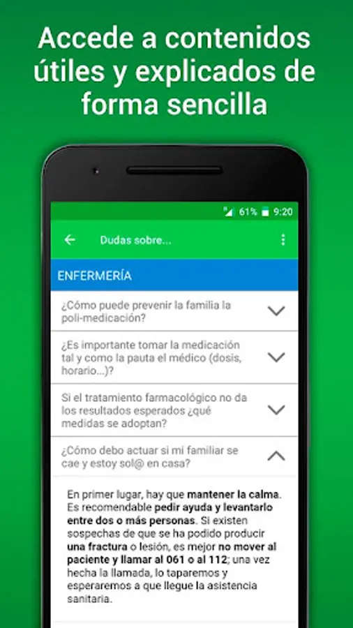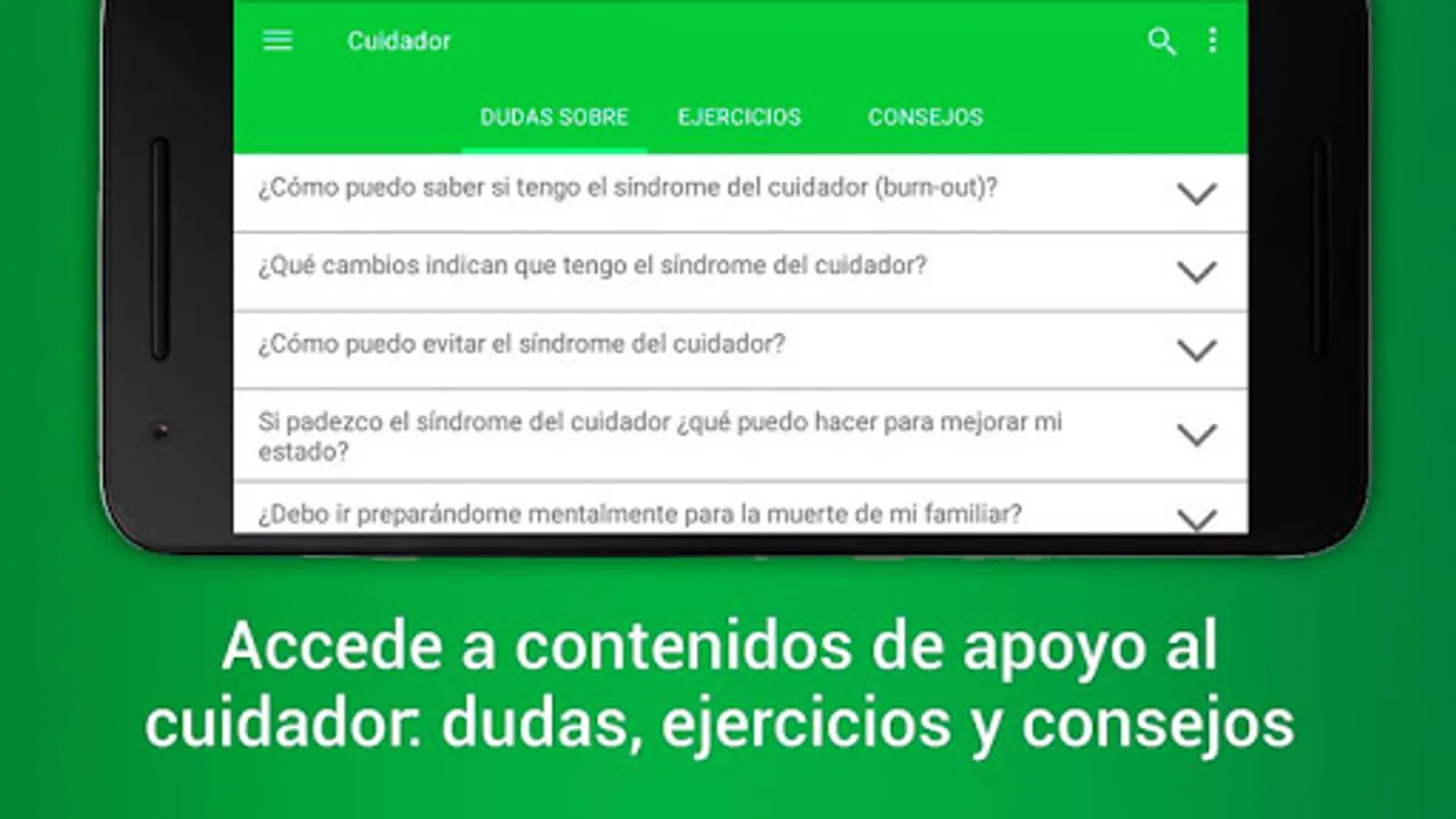 -Cuidador: Specific section for caregivers, it provides answers related to their work, stretching exercises designed for them and a series of tips for the caregiver also care.
